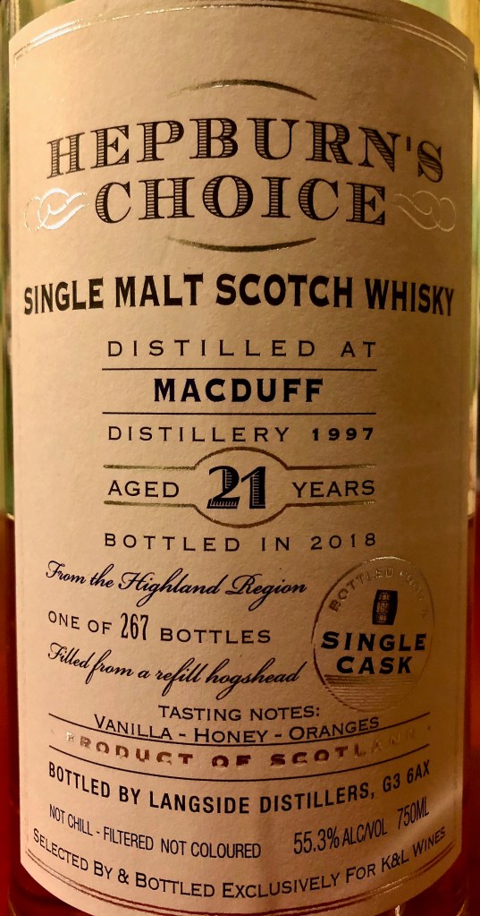 DISTILLERY – Macduff Distillery (bottled by Langside Distillers, associated with Hunter Laing, under their “Hepburn’s Choice” label)