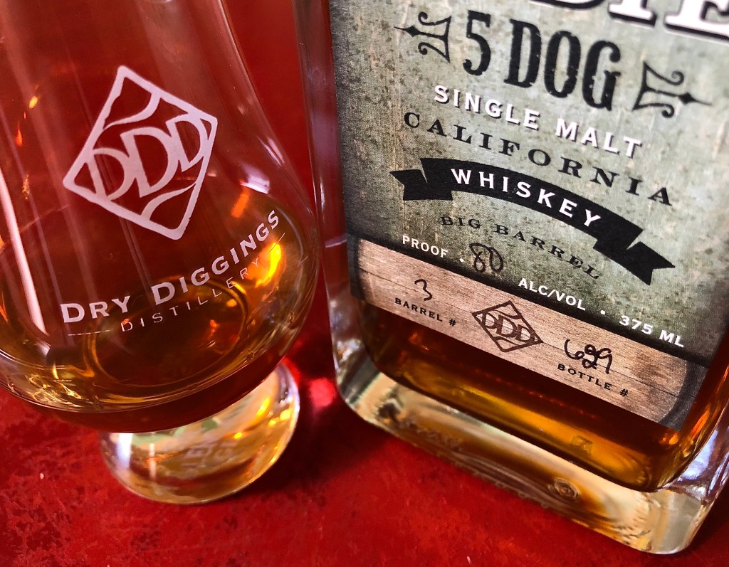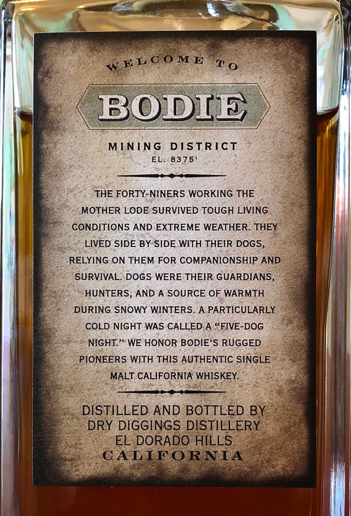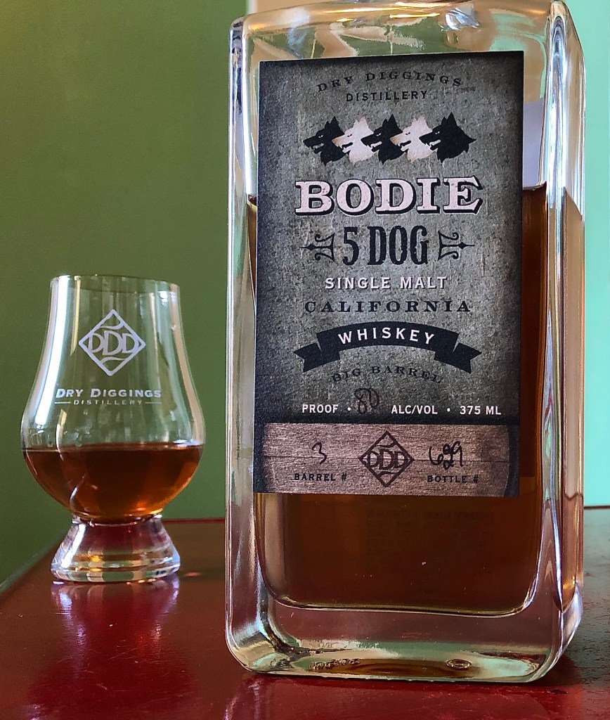 I first wrote about Bodie 5 Dog about a year ago in notes on a flight of Dry Diggings Distillery offerings, which also included their Rubicon Rye and little known but highly prized 31n50 Bourbon. I’d previously interviewed distillery owner Cris Steller. He was a gold mine of candid information and insight into the process of making these whiskeys and the motives behind doing them the way he does. I’ve since returned regularly to stock up on old faves as well as pick up the occasional experiment that Steller and his team come up with—like a single barrel Engine 49 Rum they recently bottled, a one-off that came about when they found a forgotten barrel left off to the side and realized it was a stand-alone treasure.