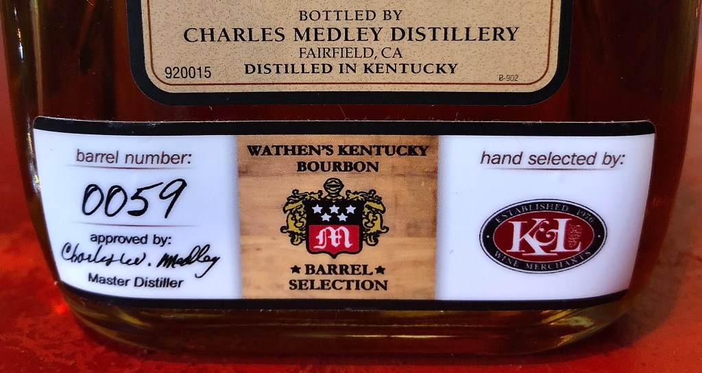 But the folks at K&L seem to suspect Barton Distillery, which quietly does a lot of contract distilling. The fruitiness of the Medley/Wathen’s profile could convince me of Buffalo Trace. The earthier, more herbal aspects could convince me of Barton, and frankly I lean more toward that possibility overall.