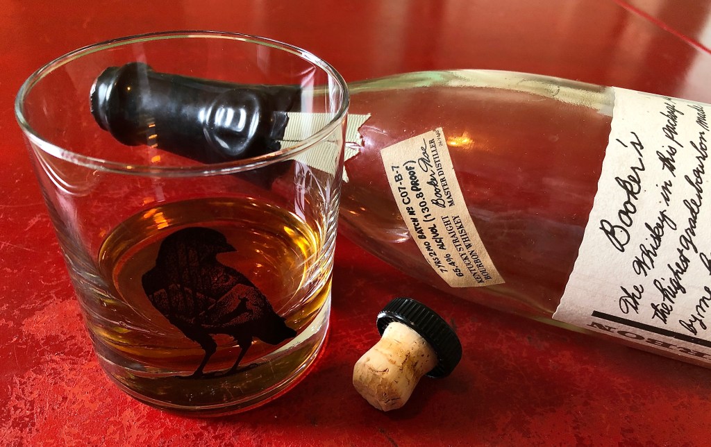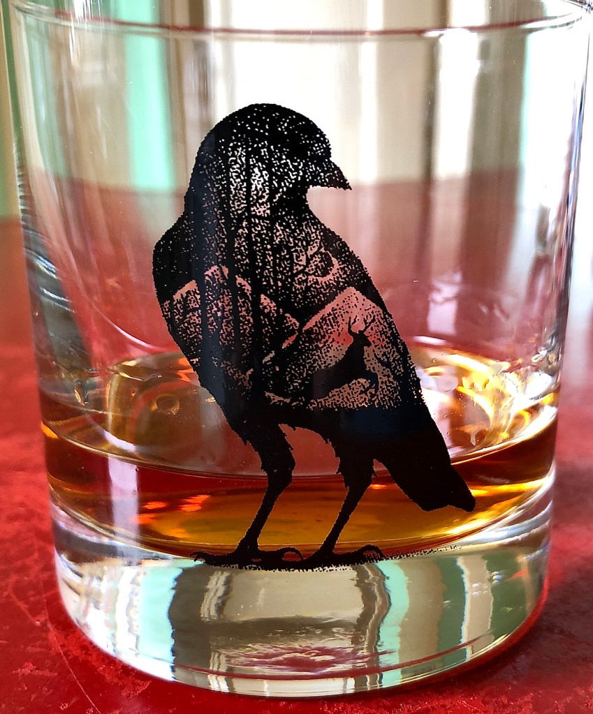 The tumbler I’m using, with the crow, deer and forest imprinted on it, was a gift from a cast of actors, one of whom was my friend noted above who moved to New York. I think of that cast and the show we made together whenever I use the glass, and my friend whenever I use it to drink Booker’s. Working on that show was an intense experience, befitting a generous pour of Booker’s! And my friend is as comforting and generous as she is intense and passionate, also befitting a pour of Booker’s.