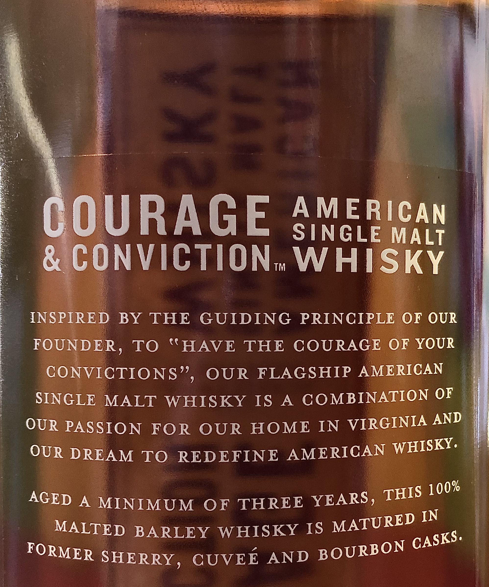 On some sips the edginess I get from this single malt conjures raw wood splinters, and yet on most sips it’s that very pleasing mineral edge one gets from good crisp white wines. So although Courage & Conviction might benefit from the depth of further aging, at 3+ years it has already achieved a notable complexity, offering multiple aromas and flavors in variation as it airs out in the bottle and glass.
