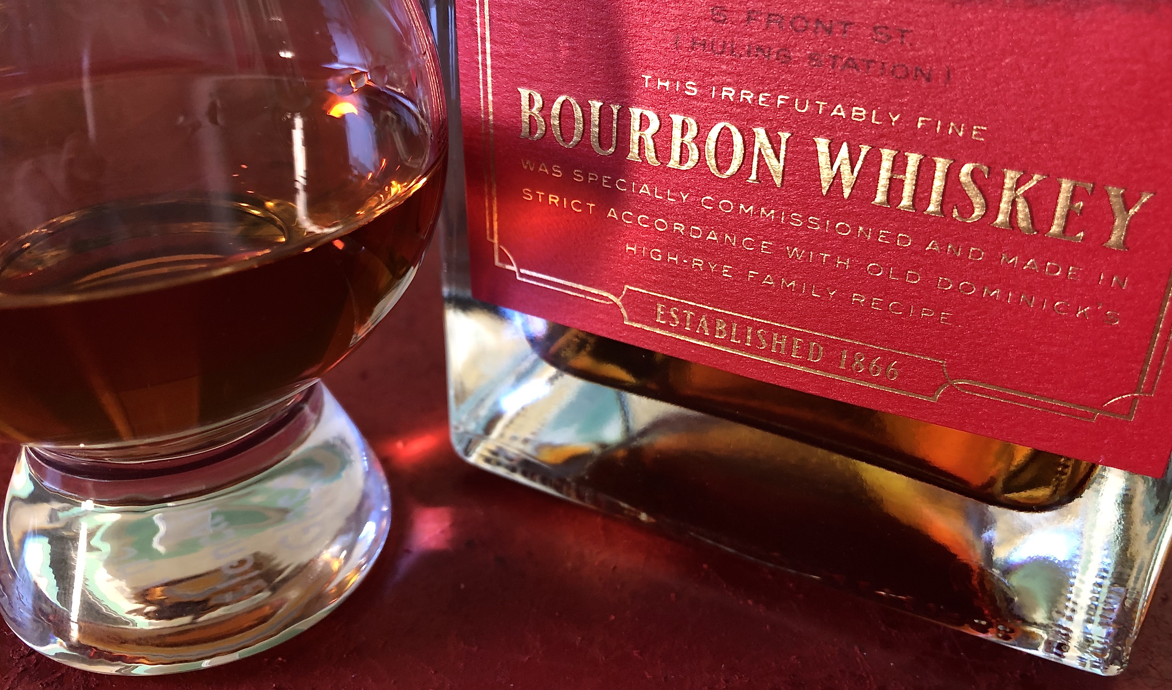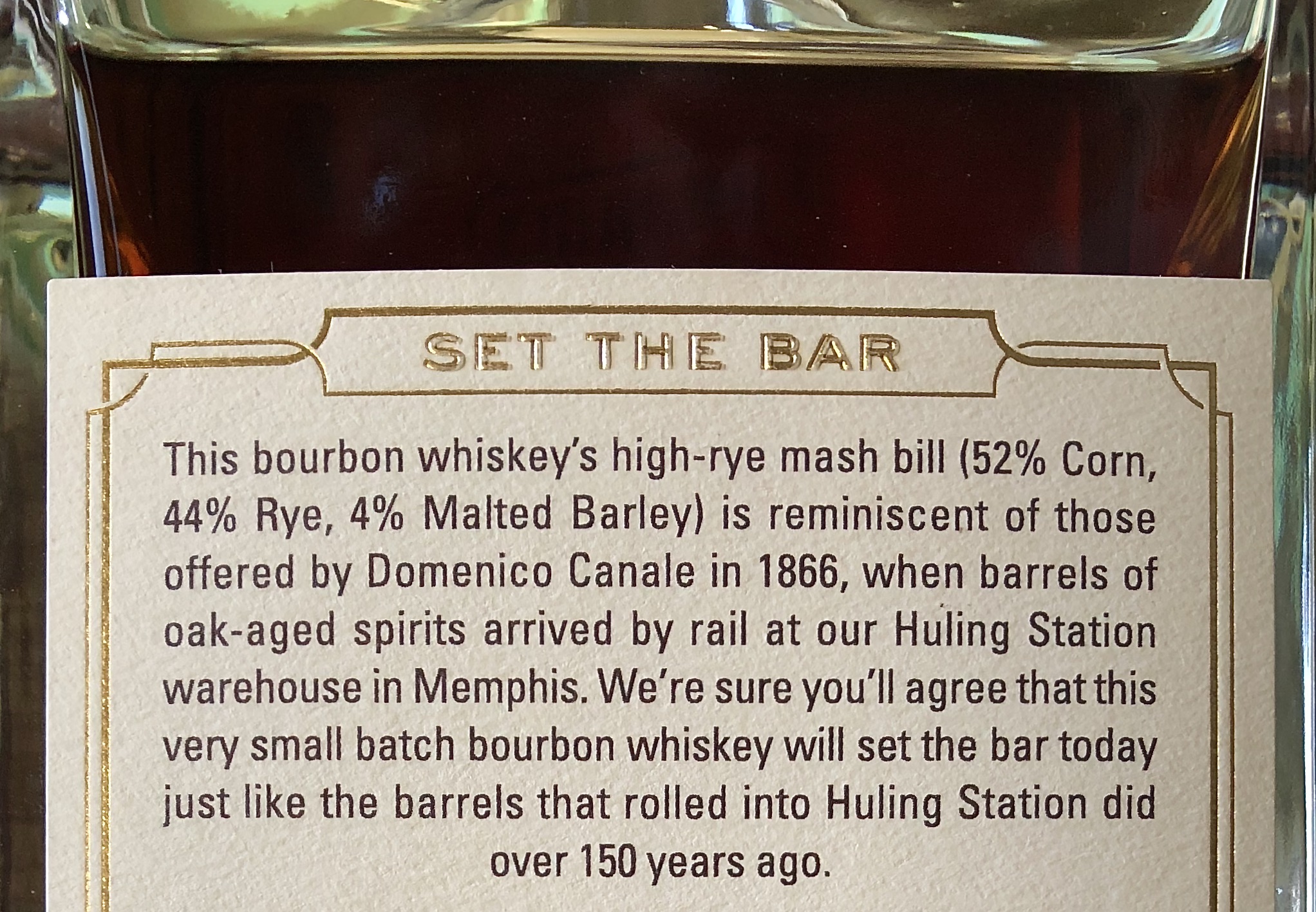 I’ll admit it’s not the flavor profile I expected from the very classic packaging. The solid, heavy, angular bottle conjures up late 19th Century pharmacy bottles. The striking red and gold label with the old-fashioned grey etching of the bottle’s namesake—Huling Station on Front Street in Memphis, Tennessee—confidently declares “good old-fashioned bourbon.” Maybe this was indeed how high-rye bourbons tasted in 1866, when Domenico Canale, the Italian immigrant who first earned money selling fruit off a street cart, established a brick-and-mortar shop where he sold his “Old Dominick” whiskey.
