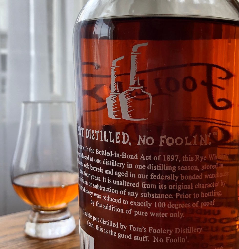 Willett tends to be pretty wild, so I’m curious to hear how it compares to the Parker’s. I’ve poured some of a Tom’s Foolery Bottled in Bond Rye that I picked up earlier this week. It’s a bit over 6 years old. A store pick from K&L. I thought it would make an interesting comparison, because Parker’s Heritage comes from one of the largest mass producers of mainstream stuff, whereas Tom’s Foolery is the opposite of that—one warehouse, one assembly line, husband and wife team, they grow their own grains… And the mash bills are very different. The Parker’s is 51% rye and the Tom’s Foolery is 96% rye.