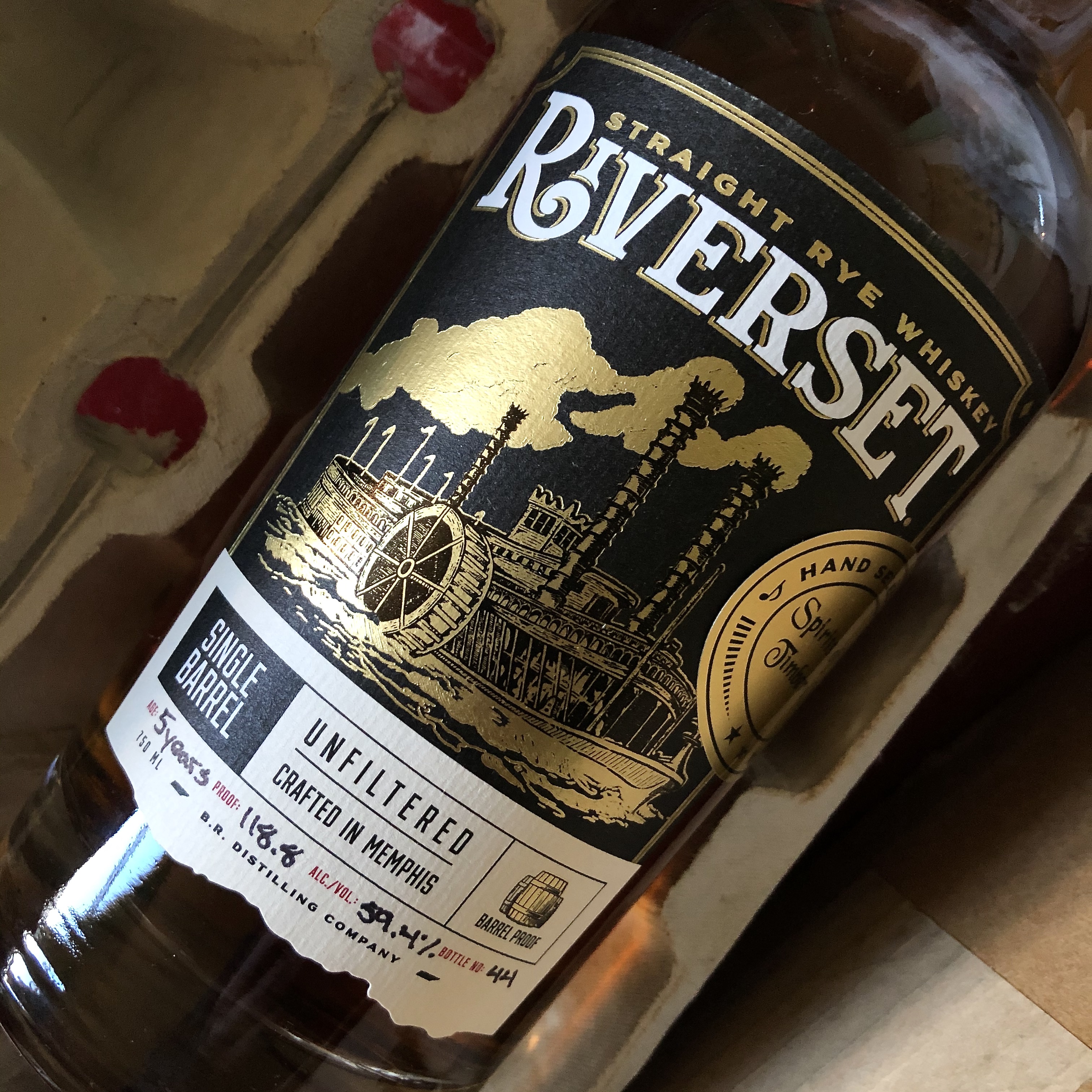 A kind TN-based acquaintance from a bourbon Facebook group I follow noticed one of my expressions of interest, made in the comments of another member’s post about one Riverset Rye single barrel or another. She reached out to me, generously offering to ship a bottle my way when one became available at a shop near her. Lo and behold, some weeks later she followed up. The bottle, selected by a shop called Spirits of Timber Creek, arrived safe and sound and I uncorked it right then and there.