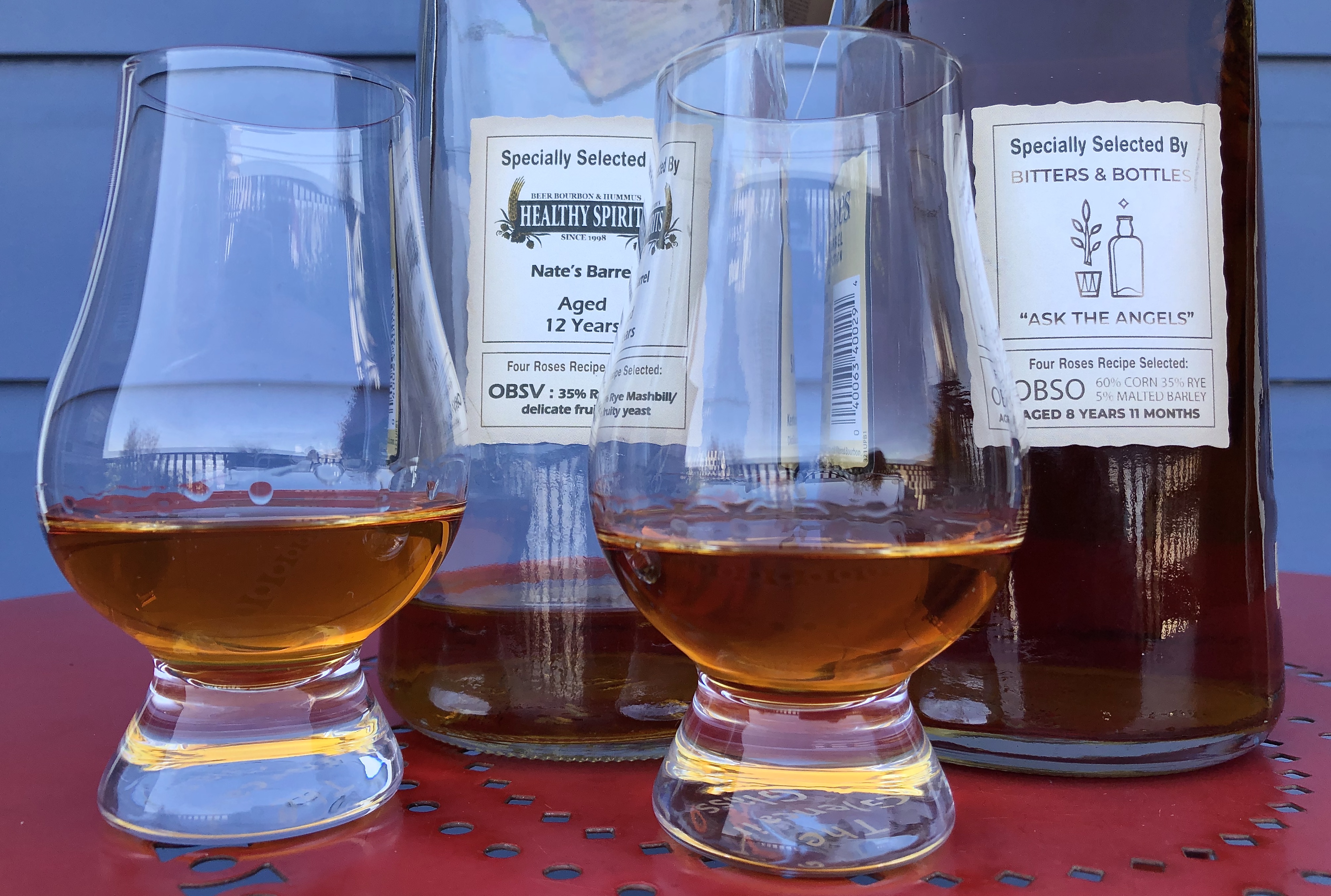 In comparing this OBSV with the previous OESV, I tasted the former on its uncorking pour and the latter at its bottle kill. For today’s comparison, though I’m near the bottle kill of the OBSV, I’m three pours into this OBSO. I wanted to allow it some air before putting down tasting notes in writing, since my past experiences with both the OBSO and OESO recipes have been studies in evolution over the life of the bottles. Something about the O yeast yields initially reserved bourbons that very gradually unfurl their riches as they take air. Usually it’s the final fourth of an OBSO or OESO that wins me over. So even at just a few pours in I may still be premature here. But, the OBSV has been at its last few ounces for some weeks, and tasting it recently it seemed to be getting over-oxidized, so, I didn’t want to risk losing it to too much air.