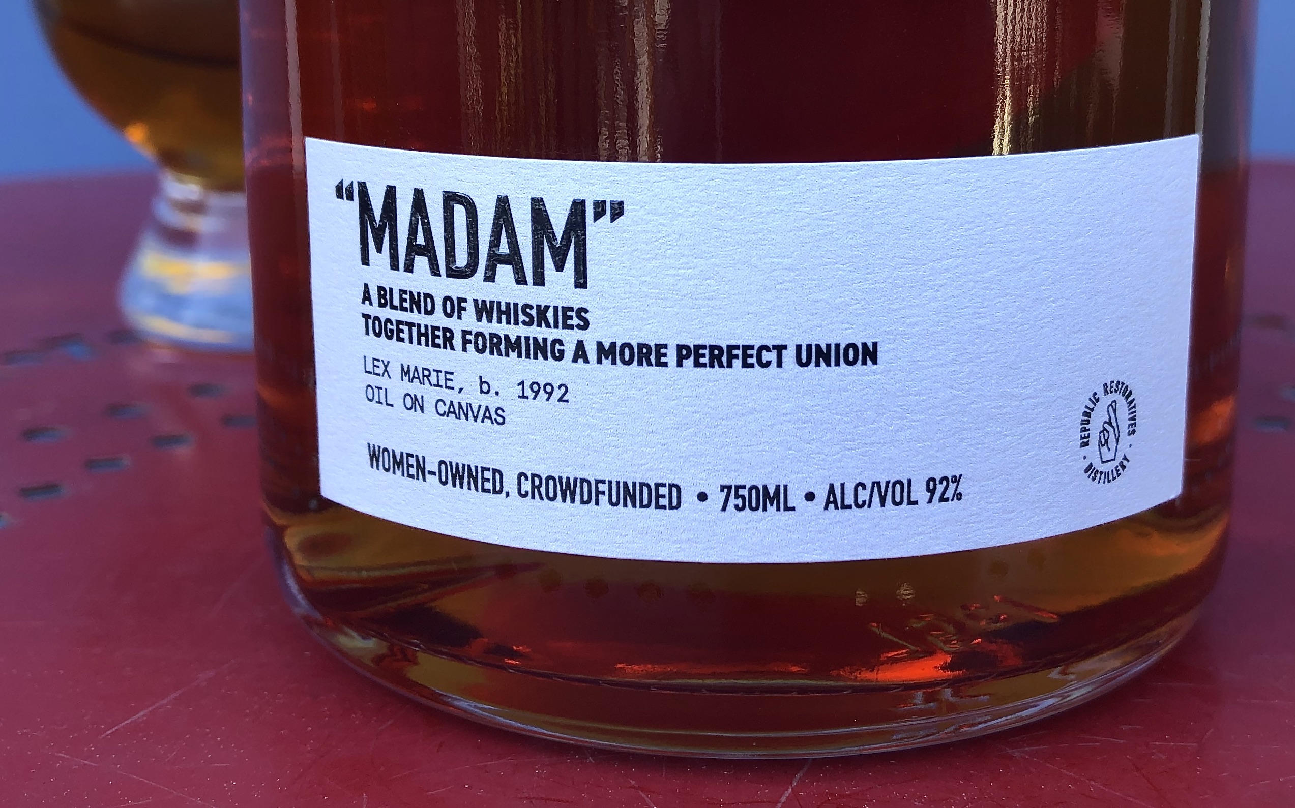 Released to commemorate the triple glass ceiling shatter that was Kamala Harris coming into the office of U.S. Vice President, Madam Whiskey and the “I’m Speaking” edition of Purpose Rye are the most clear-eyed expressions to date from Republic Restoratives, the Washington D.C. distillery, bar and event space. Women owned and crowd funded, Republic Restoratives seeks to welcome those who haven’t and still don’t often feel welcomed by the predominantly masculinized and White world of whisk(e)y. Their motto, printed on every bottle, puts it simply: “Outspoken. Disruptive. American.” One can’t deny the innately bipartisan nature of the motto’s three descriptors—though some might anyway, given the leftward leanings of Republic Restoratives. Their spirits taste lively and refreshing, and truly embody the sense of joy with which the company seems to go about everything it does.