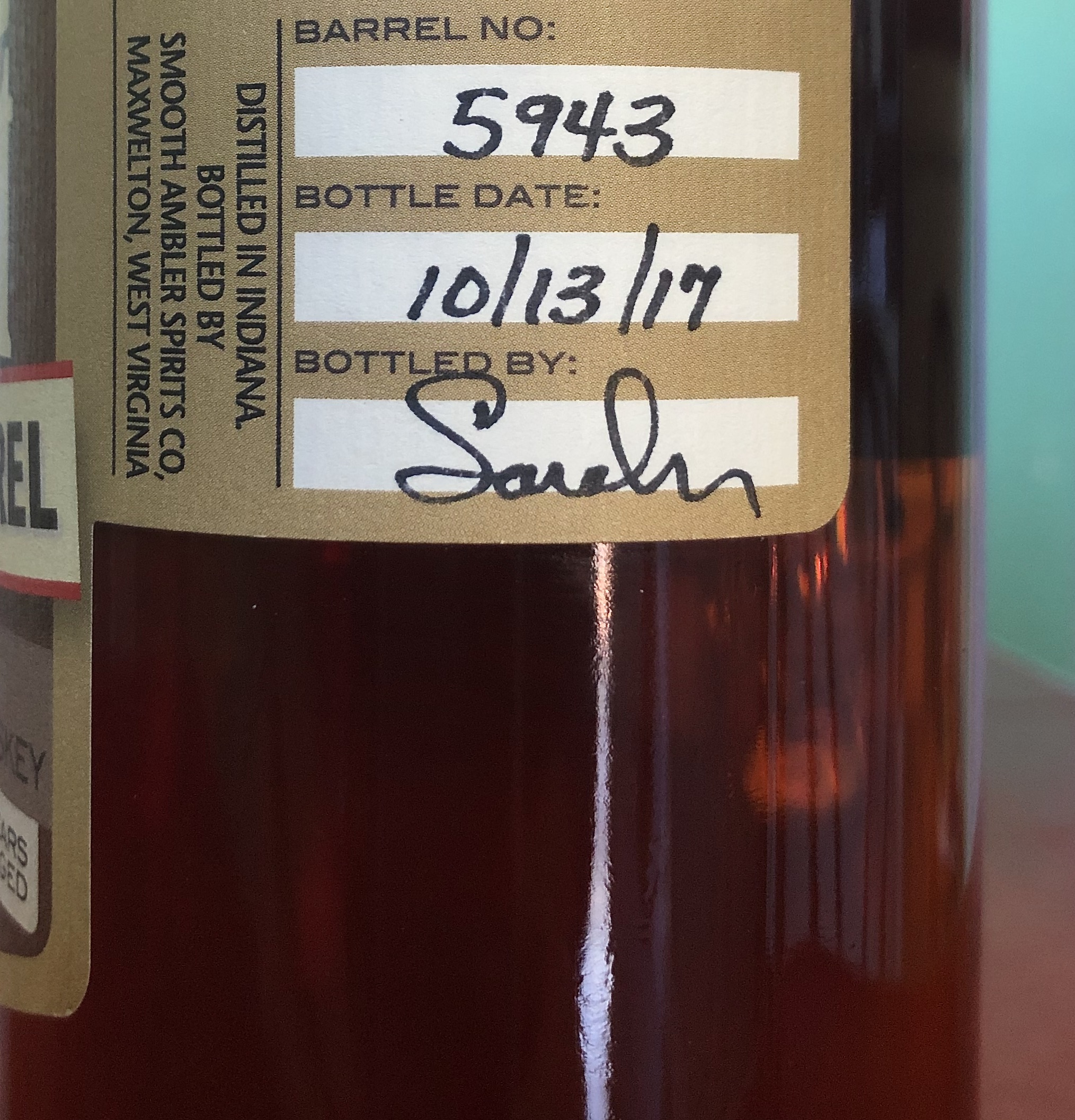 Single Barrel #5943 bottled 10/13/17 by “Sarah”MASH BILL – unstated MGP bourbon mash bill