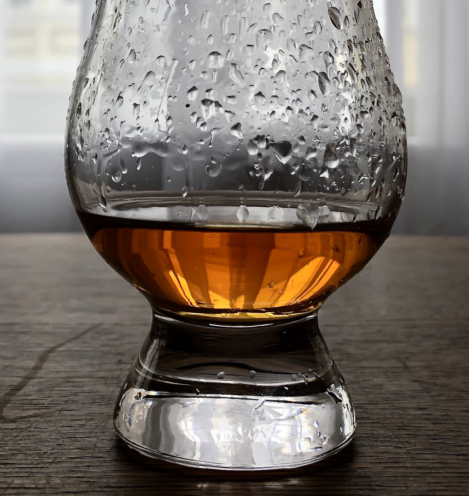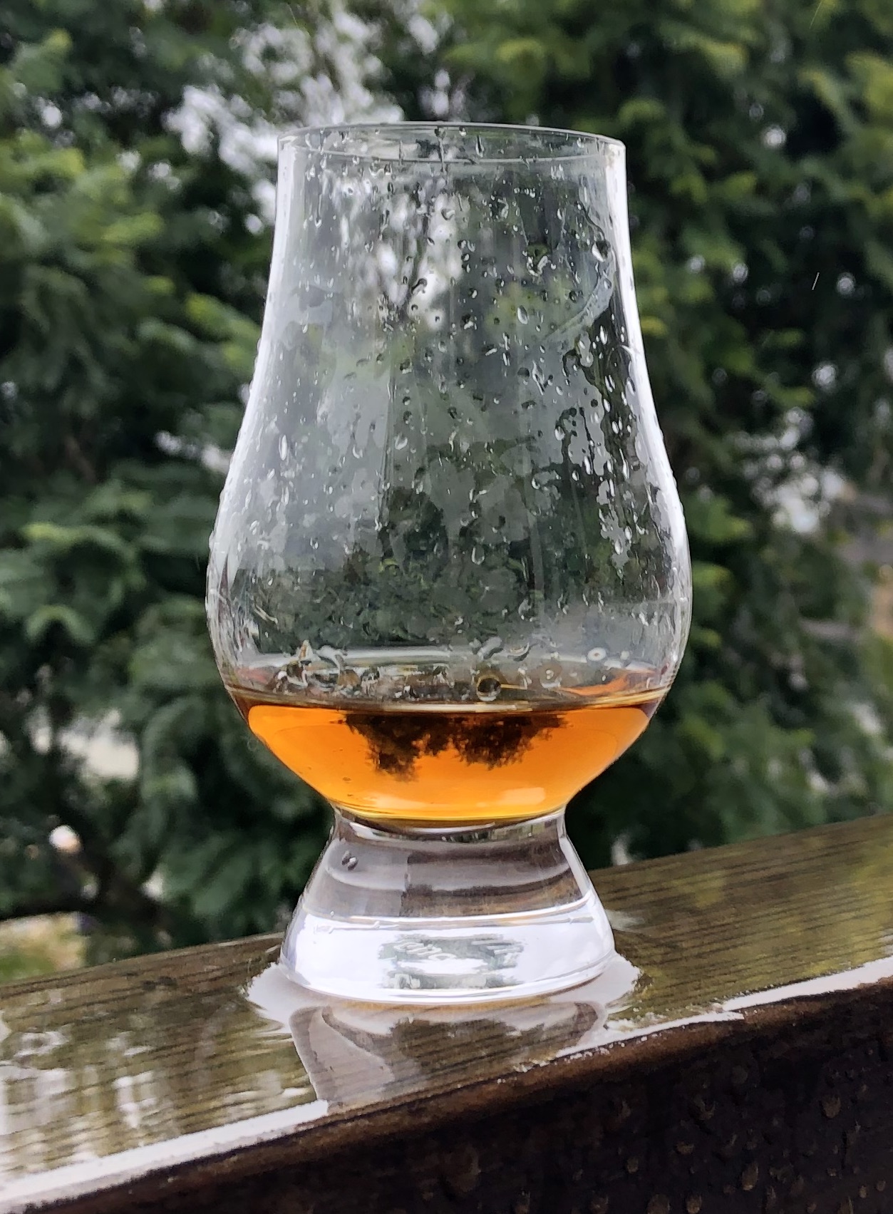 Nosing the glass back indoors, the fresh rain added a clarity around the smoke. Interesting. As if the smoke had been rendered finer in its particles. Tasting the whisky, it was brighter overall, with a nice fresh crisp biscuit note lain into its foundation. The finish was likewise brighter, that minty coolness now sepia toned—if it were a color—a kind of late afternoon Autumn sunlight. (I know whisky is “sunlight in a glass,” but can it taste like sunlight in a glass as well? I guess so!) So other than the biscuit note, rather than bringing out significantly new flavors, the addition of fresh rain brought out new qualities. Very interesting.