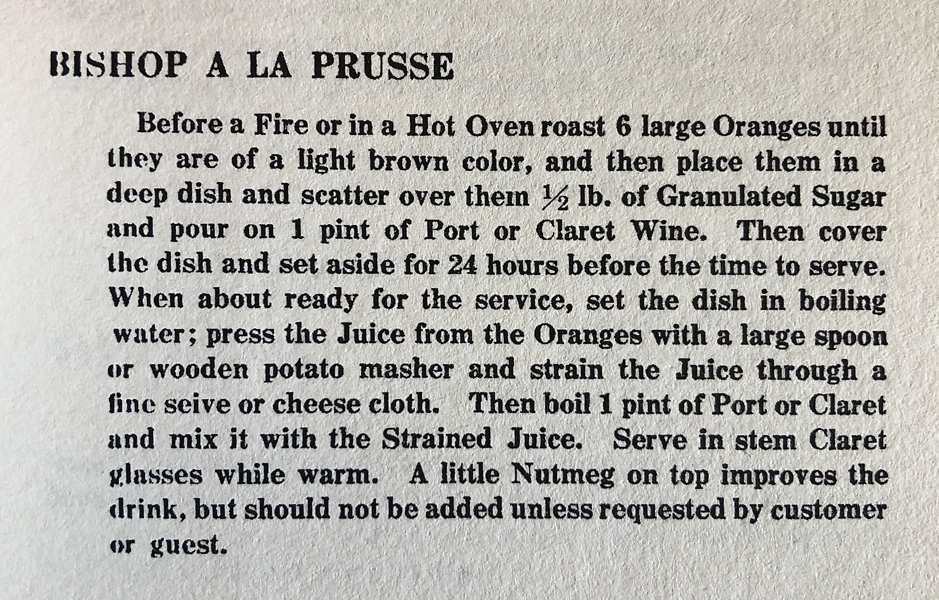 Also, the range of unusual and specific cocktails, never seen by me on any contemporary cocktail menu, are delightfully intriguing. The “Bishop a la Prusse,” for example, commands a full paragraph rather than the usual vertical list of calculated ingredients. It is so complex as to involve an oven, six large oranges, and twenty-four hours of preparation. That’s what I’m talkin’ about! Want to impress your party guests? Look no further than the Bishop a la Prusse.