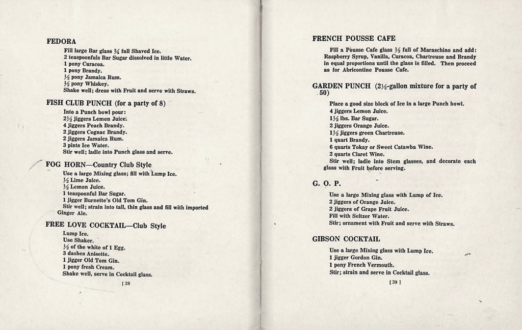The recipes are listed alphabetically, each looking not unlike a short E.E. Cummings poem. They call for largely familiar ingredients—Angostura Bitters, Bacardi Rum, Old Tom Gin. Less immediately recognizable mixers also appear—Batavia Arrack, Cusenier Grenadine, Sweet Catawba. Bullock assumes the reader’s understanding of common measurements like 2 dashes, 1 jigger, and 1/2 pony. (🐴?) It is this blend of the familiar and the not as much that together provide both access and mystery, prompting a need for further effort on the part of those of us not fully schooled in the etymology of mixology.