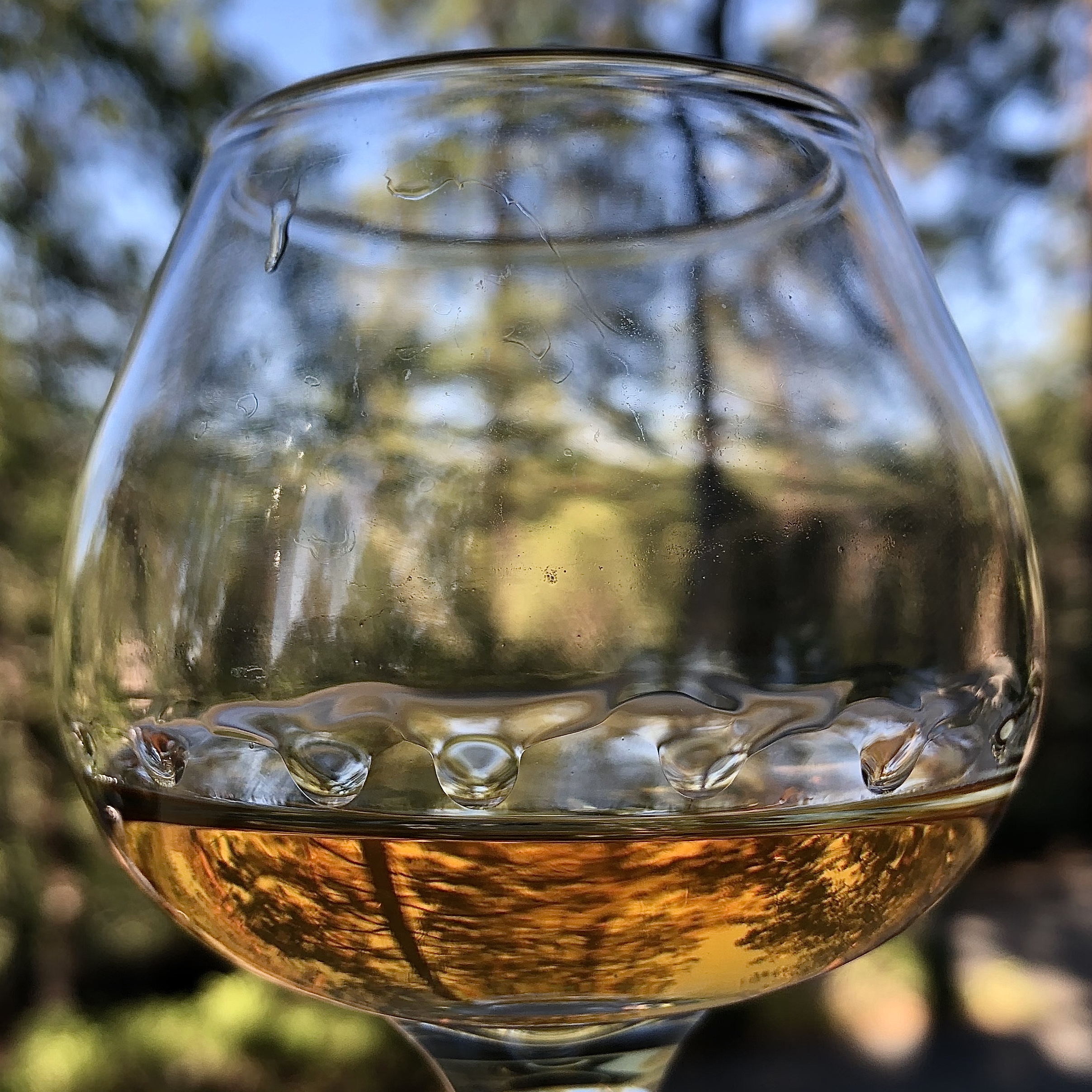 COLOR – toasted russet orange, with bright brassy glints as well as faintly green-tinged lemony yellow glints, and often the forest around me inverted in the whiskey creating intriguing lines like some modern art painting