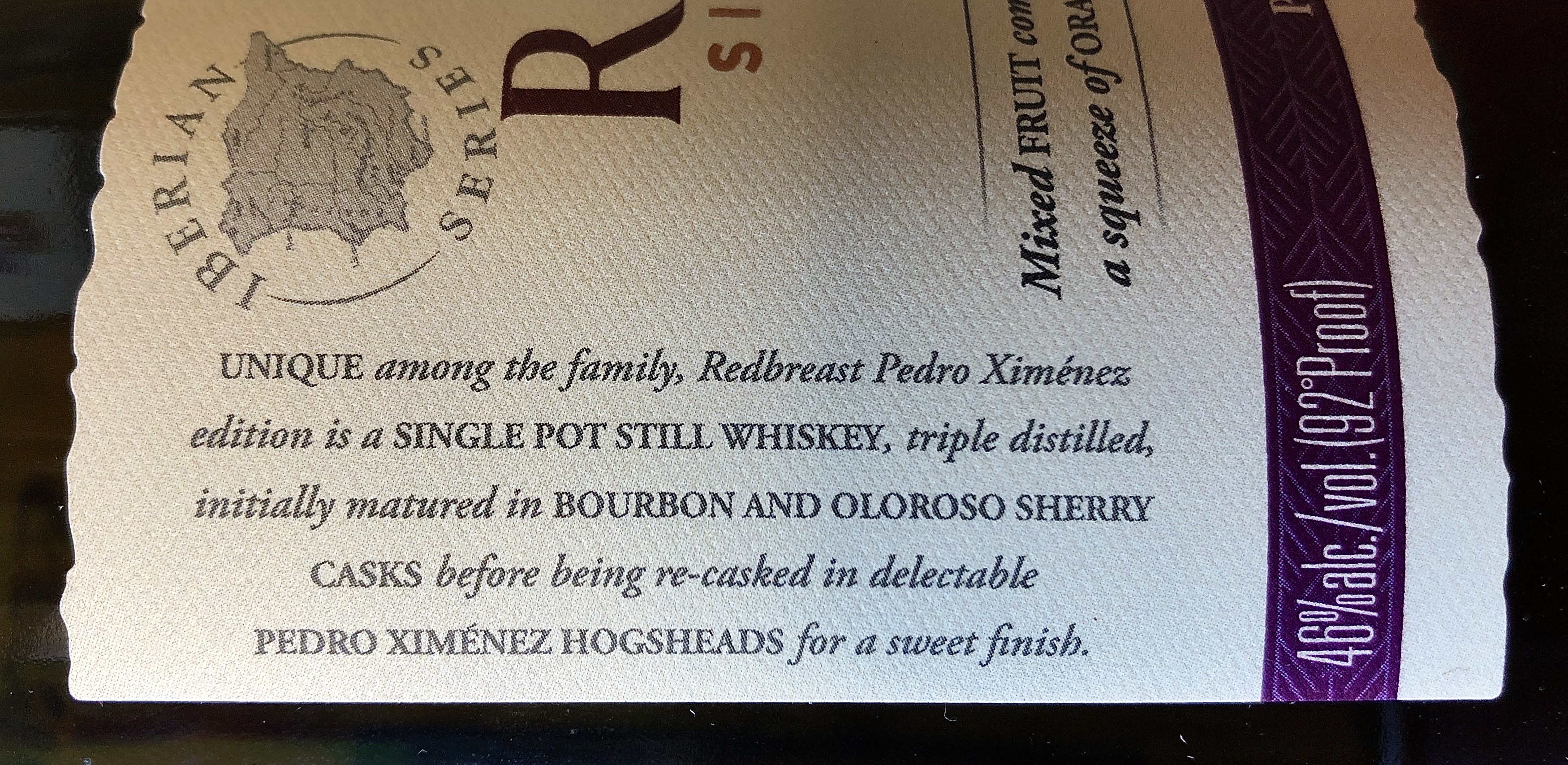 But why add the American “bottled in bond” status to an Irish whiskey, especially when it already has its own national distinction, likewise noted on the Redbreast PX box, “single pot still whiskey,” a quintessential Irish creation? I would understand doing this for a Redbreast release that in some manner connected collaboratively to an American whiskey. But a whiskey finished in Spanish sherry casks, released as part of a series called “Iberian” in reference to the peninsula of Spain and Portugal?
