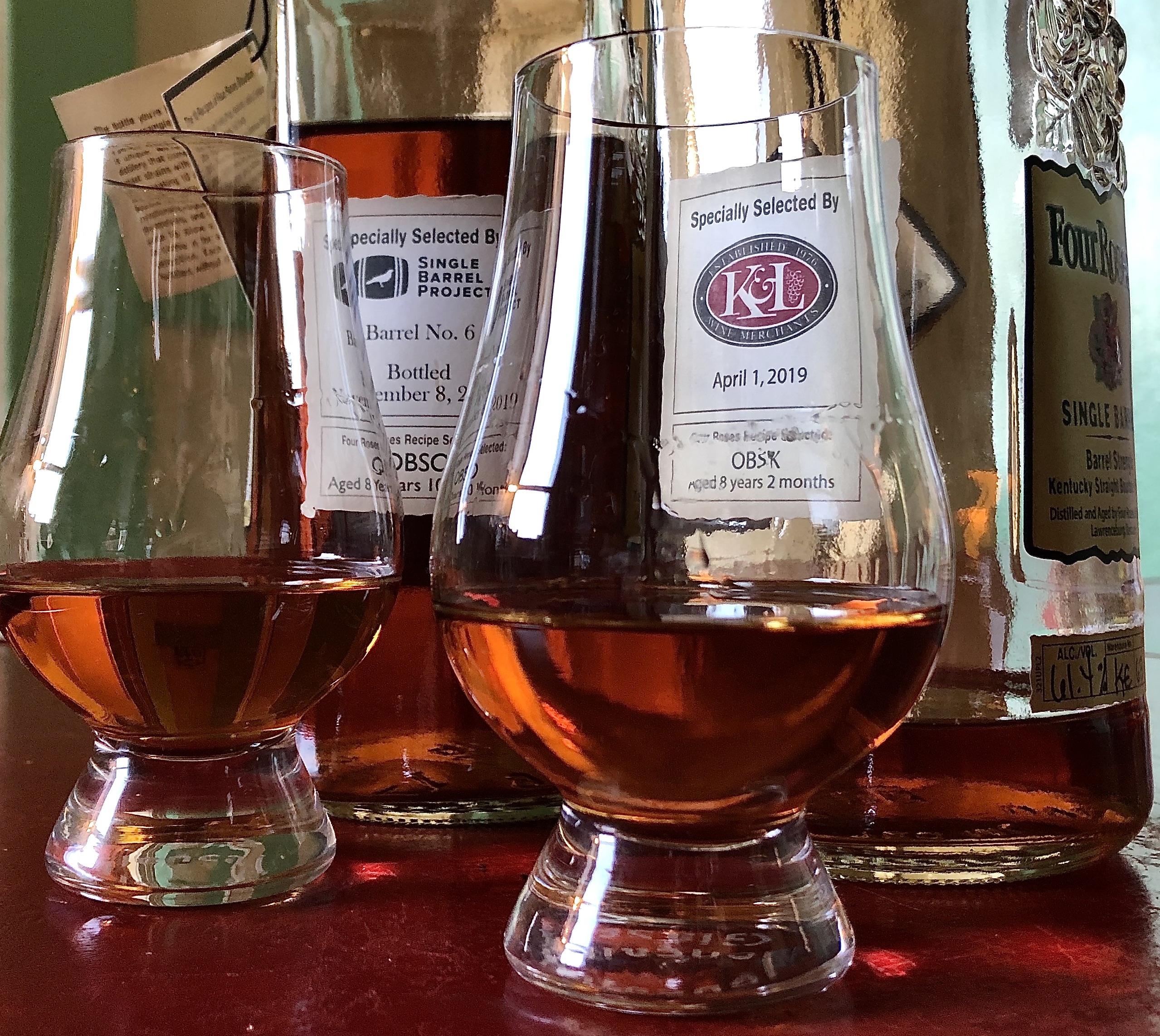 These two bottles use the same mash bill (B), but differ in the yeasts used (K verses O) as well as 8 months in age. The proofs vary by 16 degrees. And their warehouse placements are different. That last bit is a level of detail I’ve not endeavored to track. There are Four Roses fans who do track warehouse stats, however. To that end, for those interested, a quick review of how to read a Four Roses single barrel label can be found as an Appendix to the end of this post.