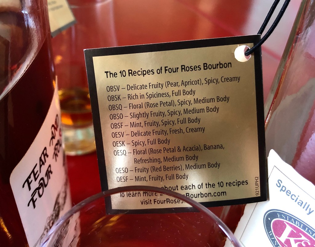 The fourth letter refers to one of five yeast strains—F, K, O, Q, V—each providing their own impact on flavor. Four Roses attaches a tag to the neck of their single barrel bottles featuring this handy at-a-glance recipe guide, with very general tasting notes: