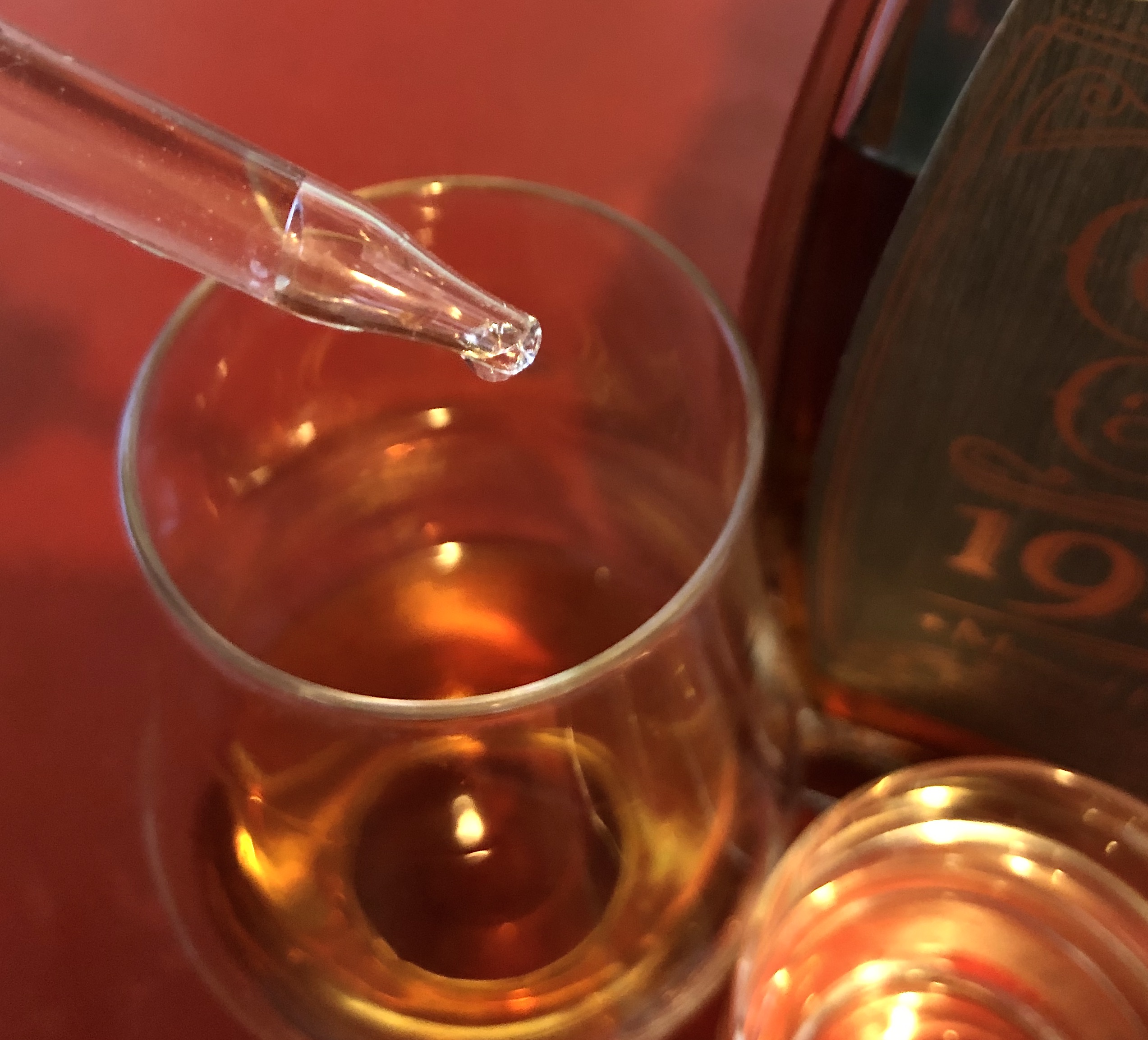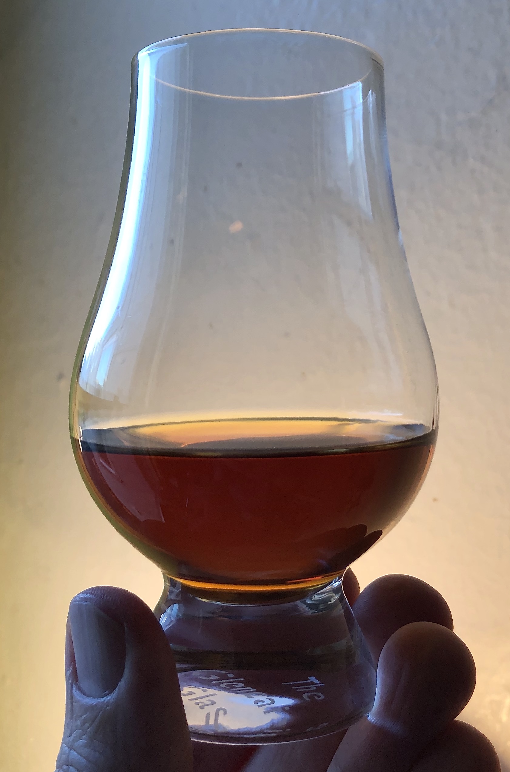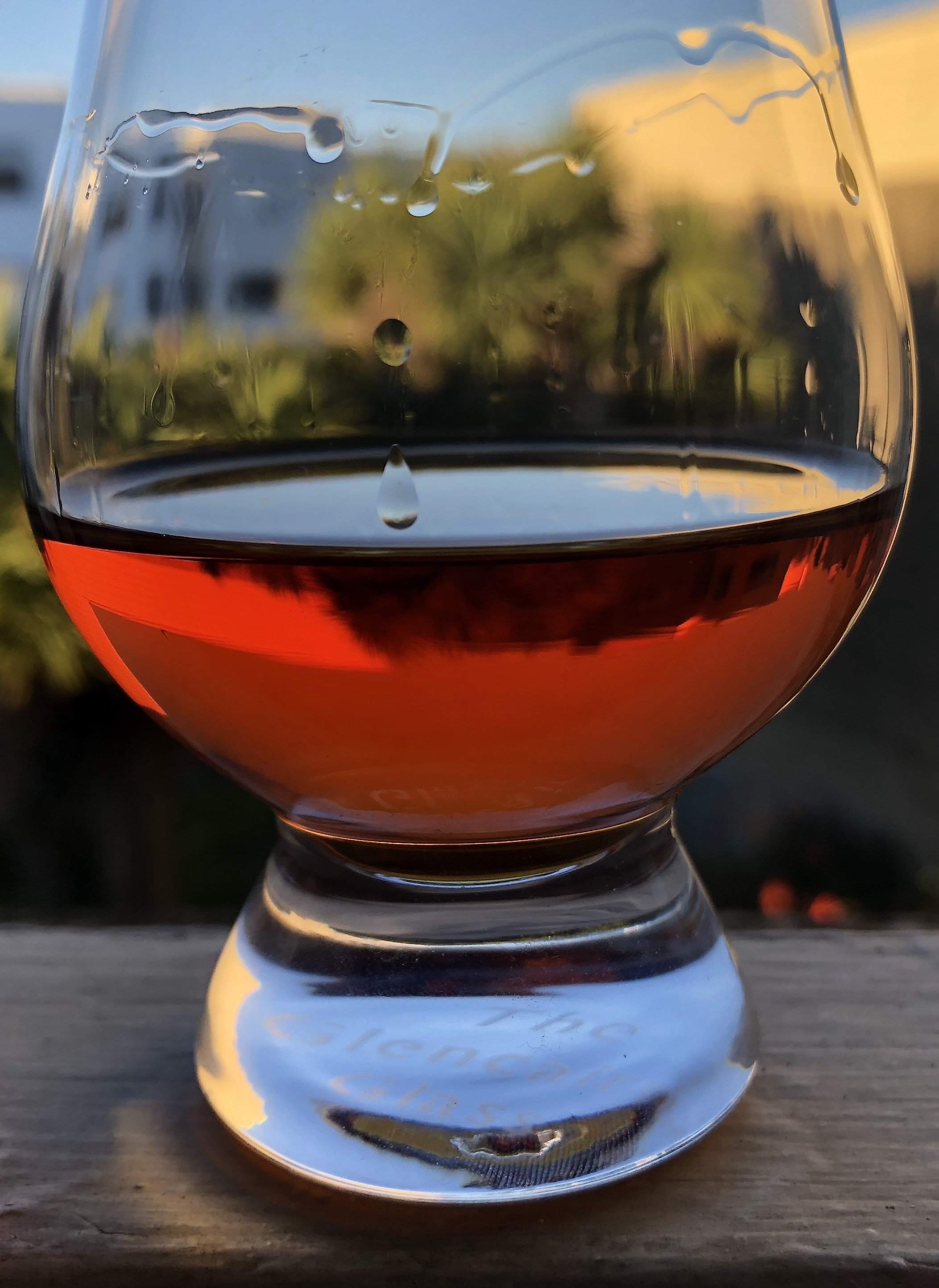 Wanting to give it a shot from another angle, I added 7 drops of water and let it rest for 10 minutes… The nose carried the same basic notes with a notch less force behind them, and now also an added cinnamon note. The taste had less teeth to its bite, allowing more apricot (very tart) and caramel to come forward, still wrapped in the burnt copper wiring and metallic battery aspects. The finish likewise showed more apricot and caramel, with the other notes still in attendance…