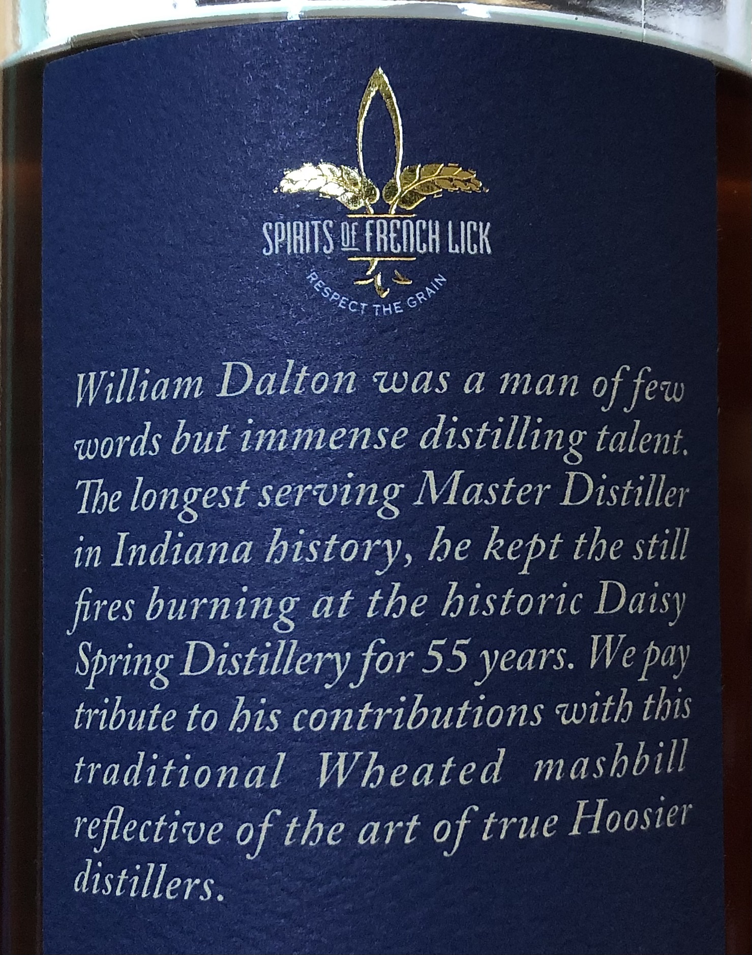 And so the prospect of a wheated bourbon from Spirits of French Lick wasn’t something I could pass up. Like all Spirits of French Lick products, it’s named after an historical Indiana figure—in this case the master distiller of 55 years for the state’s long gone Daisy Spring Distillery. And like all their products the labelling is both stylish and refreshingly informative about what’s in the bottle.