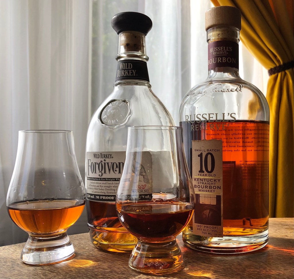 Given that subtle Wild Turkey funk aspect, I thought it might be interesting to taste this vintage Russell’s Reserve next to the much funkier Forgiven Batch 302. Their proofs are similar, with Forgiven just a hair warmer at 91 to the Russell’s 90. Both were bottled in 2013, so their contents come from the same era. Forgiven has rye mixed into it, and the age of the blend is not stated. With all that in mind I poured a glass of each.