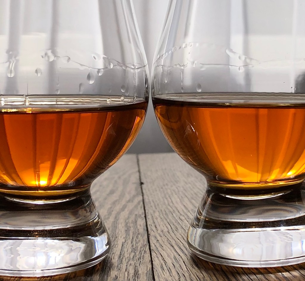 Their colors are very similar in the intensity of orange and clarity of how they reflect the world nearby, with the Forgiven tinting slightly darker. Both are similarly viscous, leaving nice drips along the inside of the glass.