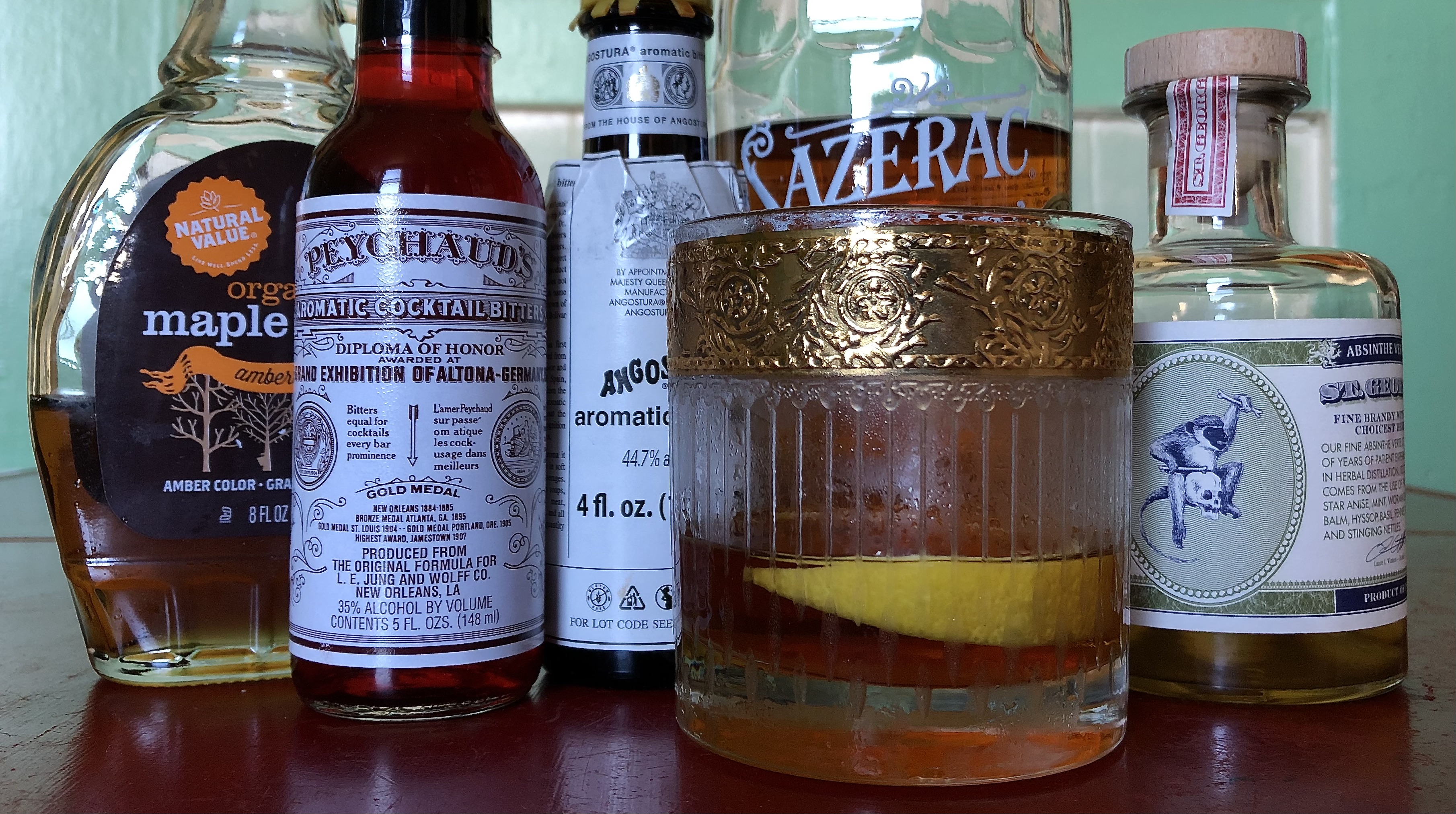 - Add 3 dashes of Peychaud’s and 2 dashes of Angostura Bitters to the tumbler, plus a teaspoon of maple syrup (simple syrup is more common), and stir it up. Give the lemon zest a twist above the drink and drop it in the glass.