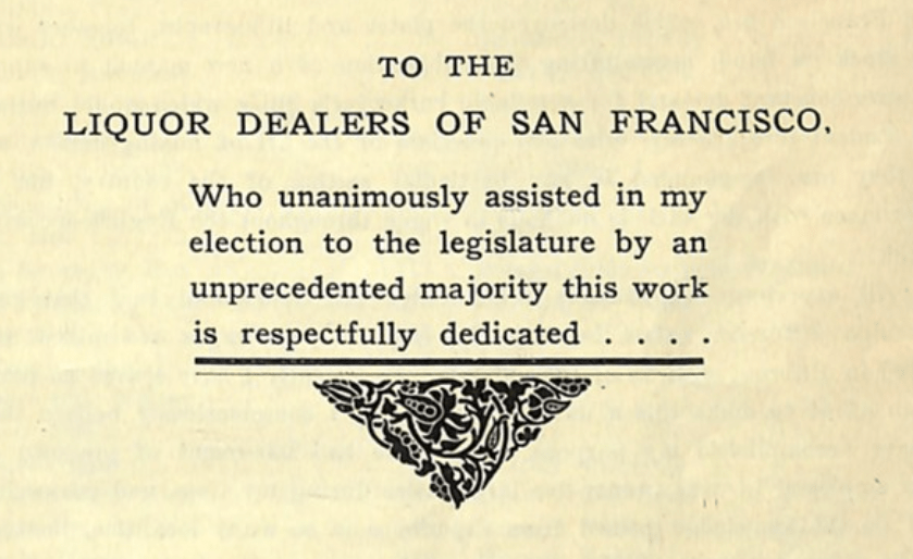 Boothby was born in San Francisco on November 10, 1862, and eventually died there on August 4, 1930, at the age of sixty-eight. He was a true San Franciscan, not only for being a lifelong local figure, but for becoming such an apparently flamboyant and popular one. A serious mixologist long before the term got popularized by the 21st Century nouveau inclination toward all things artisanal, he also ran for office and was elected to the California State Legislature, representing San Francisco, demonstrating the longstanding relationship between liquor and the law. His book’s dedication underlines this point: