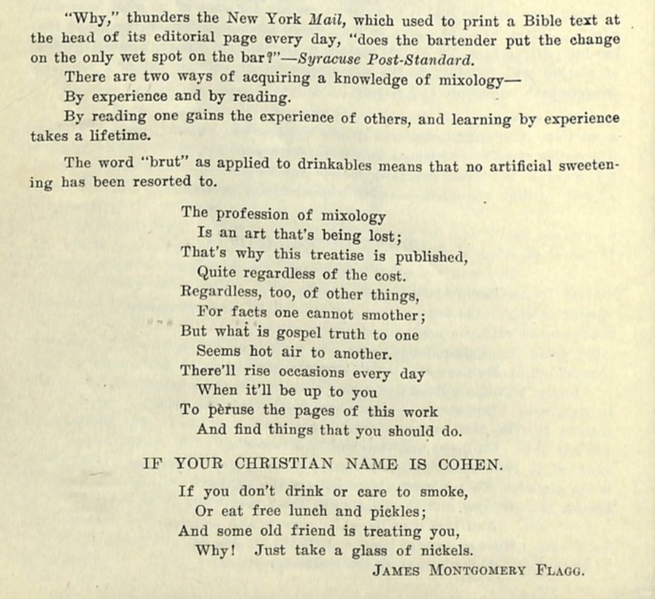 If that list is long, the full contents are epic! The tireless verbosity of the text might speak to Boothby’s evidently abundant confidence. As an actor he was apparently known to show off. His book’s commentary never shies from pronouncing his expertise, positioning him as the “standard authority” and even “deity” of bartending.