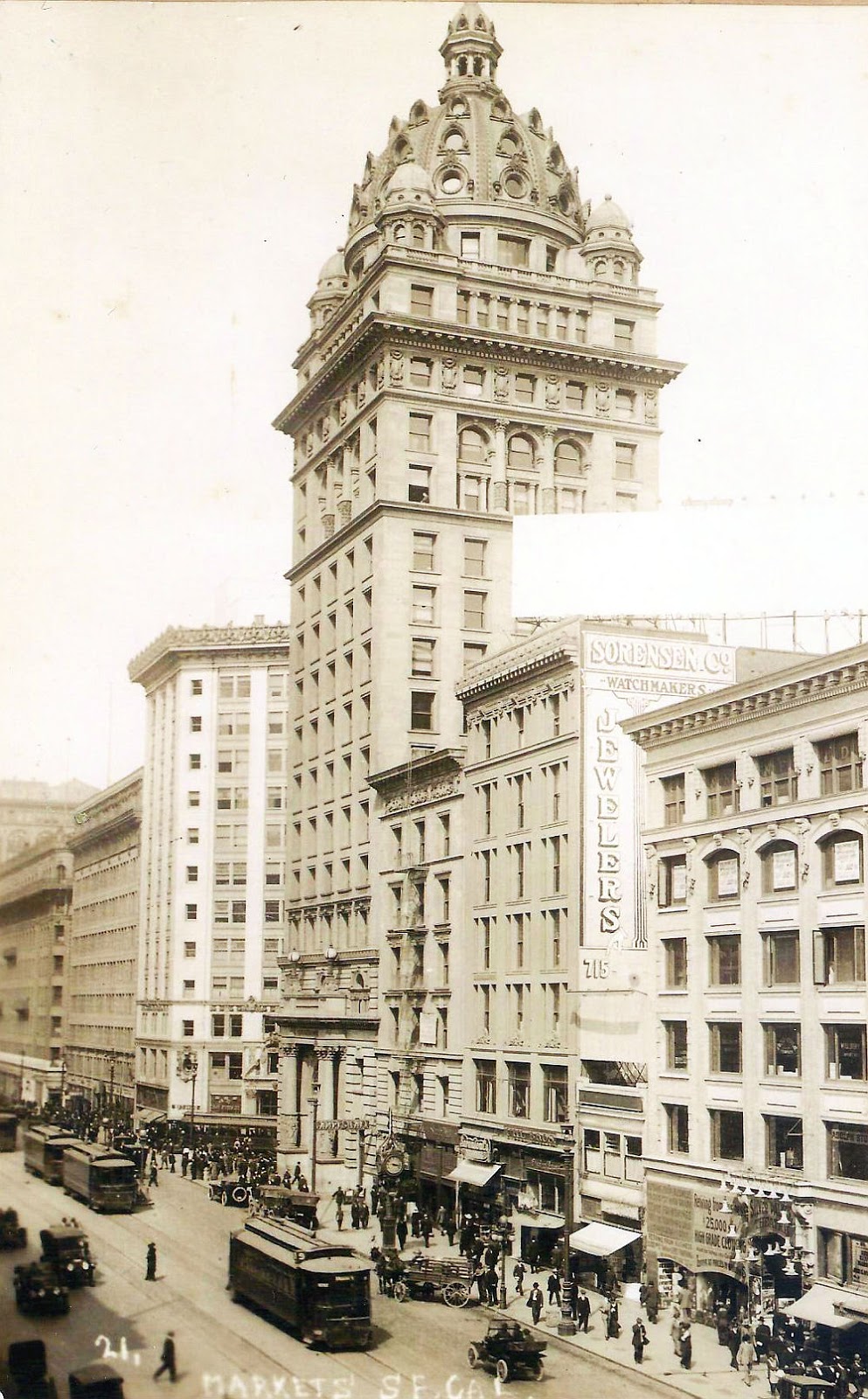 This was a tricky one to locate at first. It took some walking back and forth on the 700-800 blocks of Market Street, and finally a bit of a Google into the history of the conspicuously ornate Humboldt Bank Building, built in 1908. I’d been confusing the elaborate Humboldt with another former glory, located a block away, known today as Central Tower.