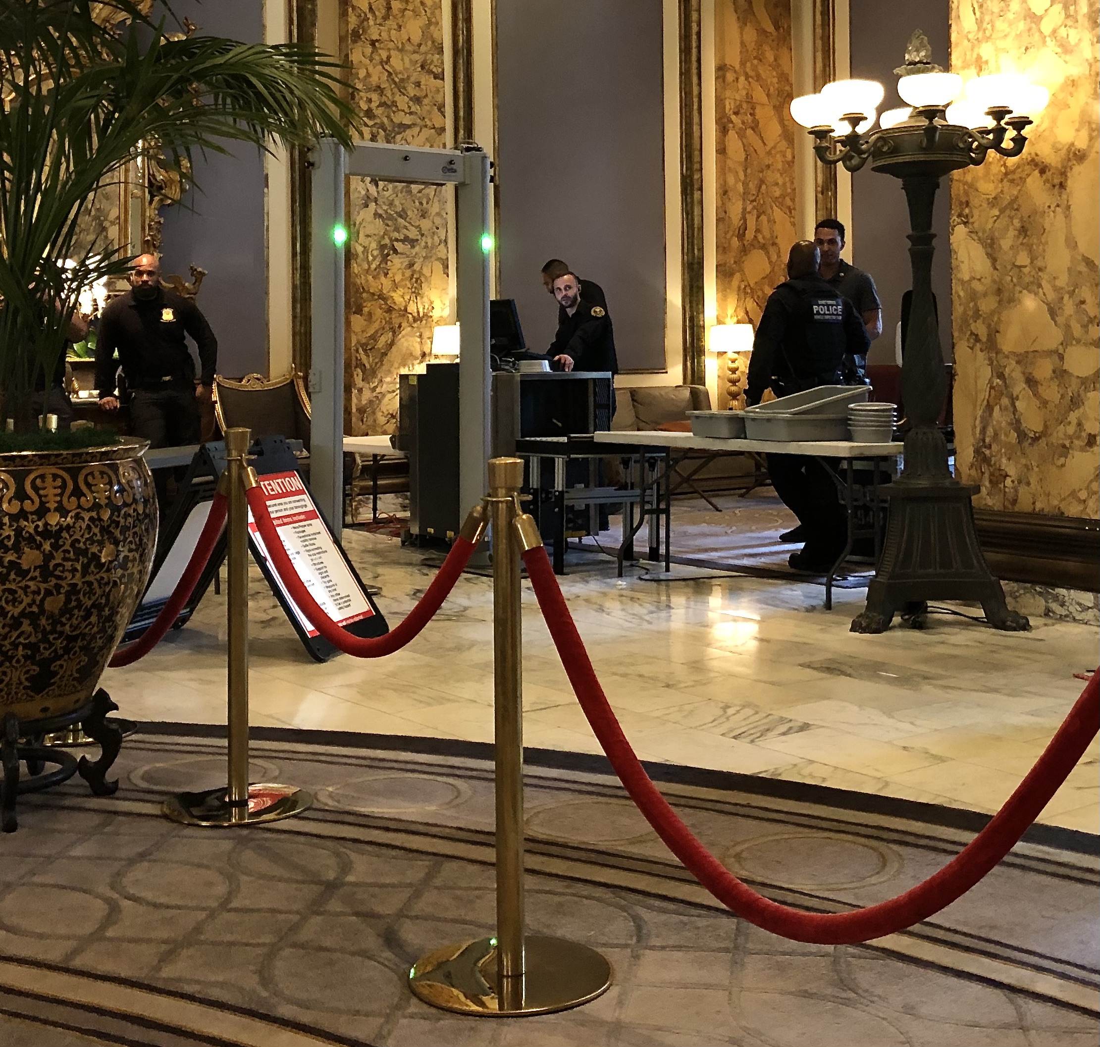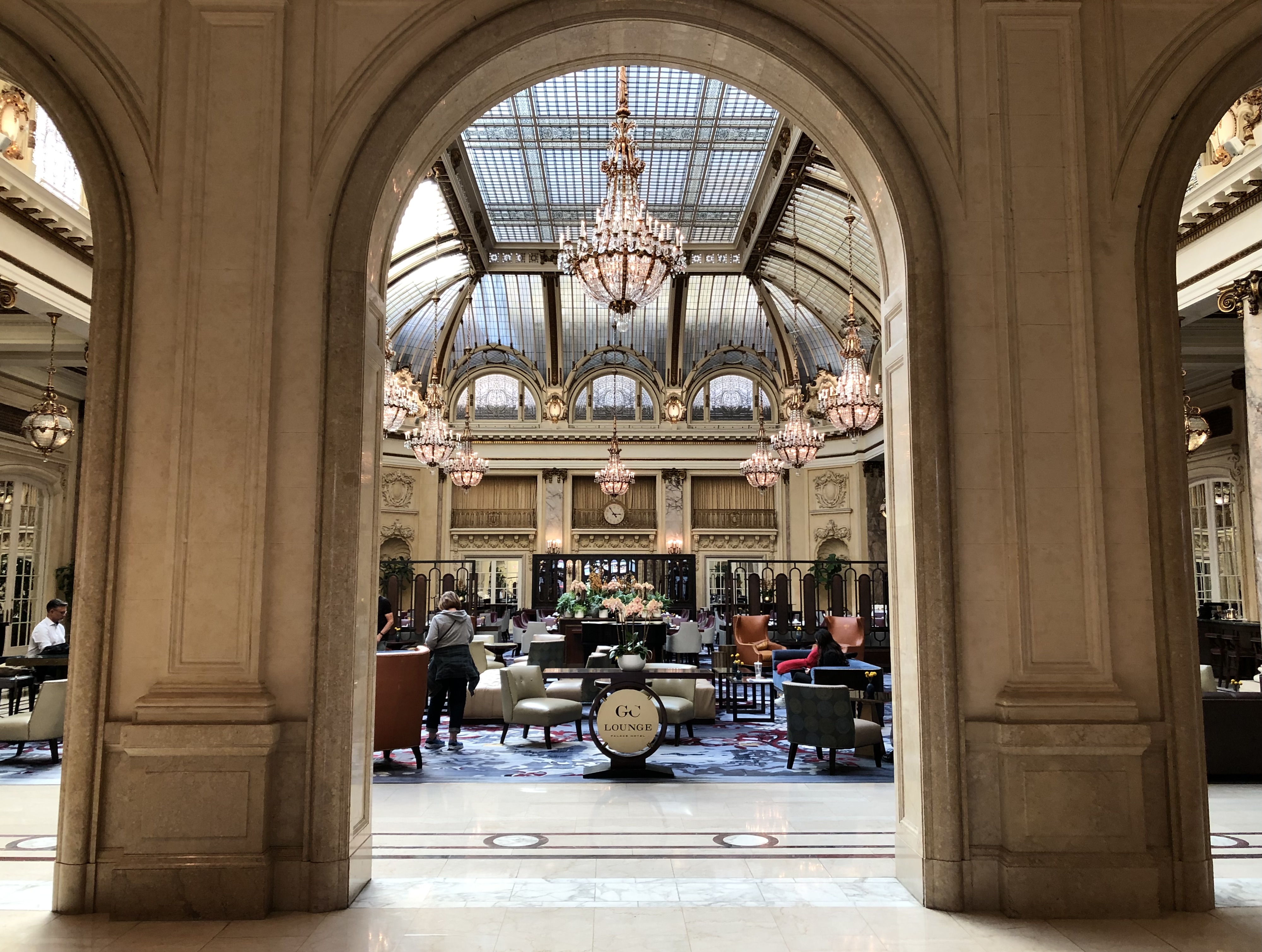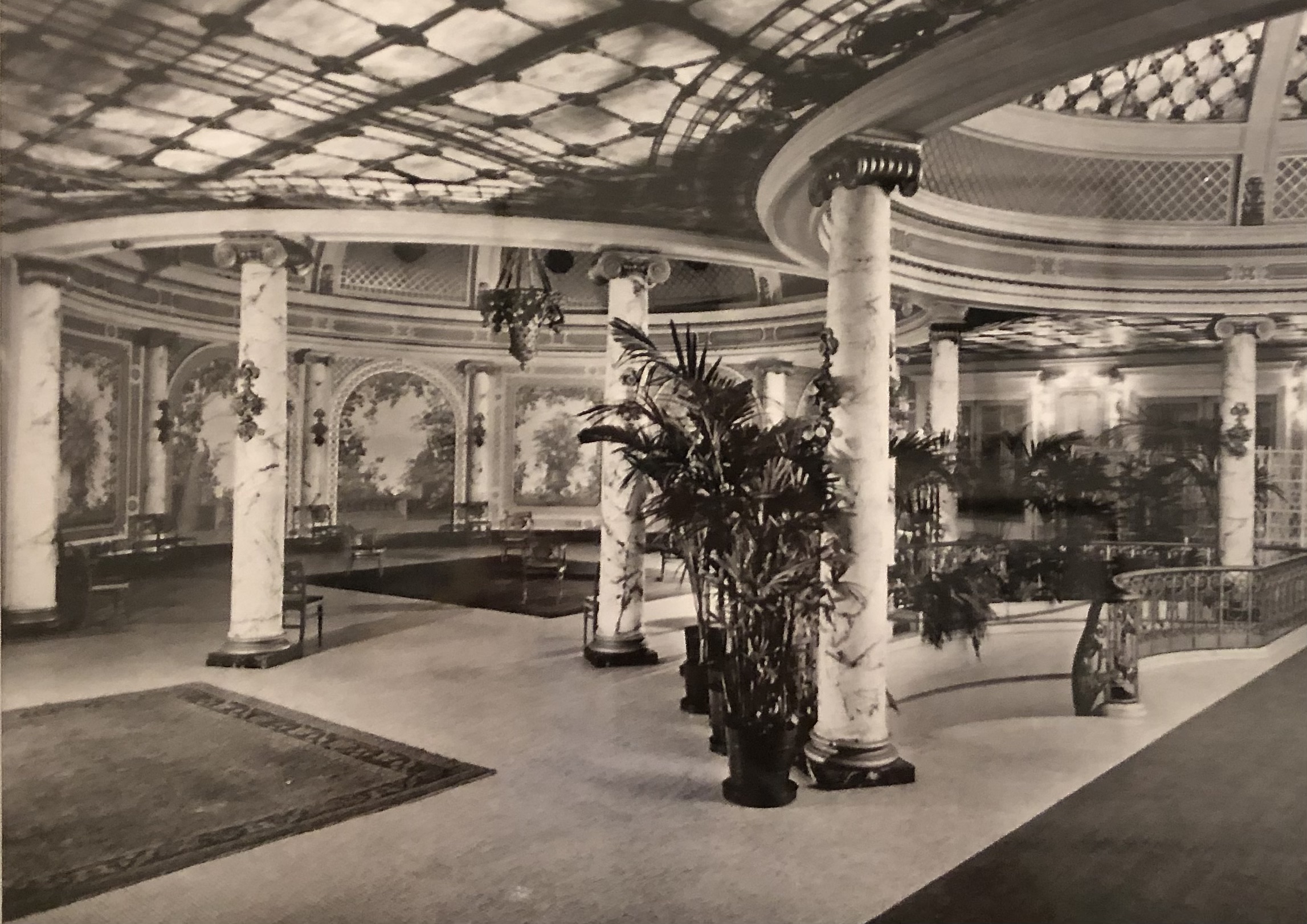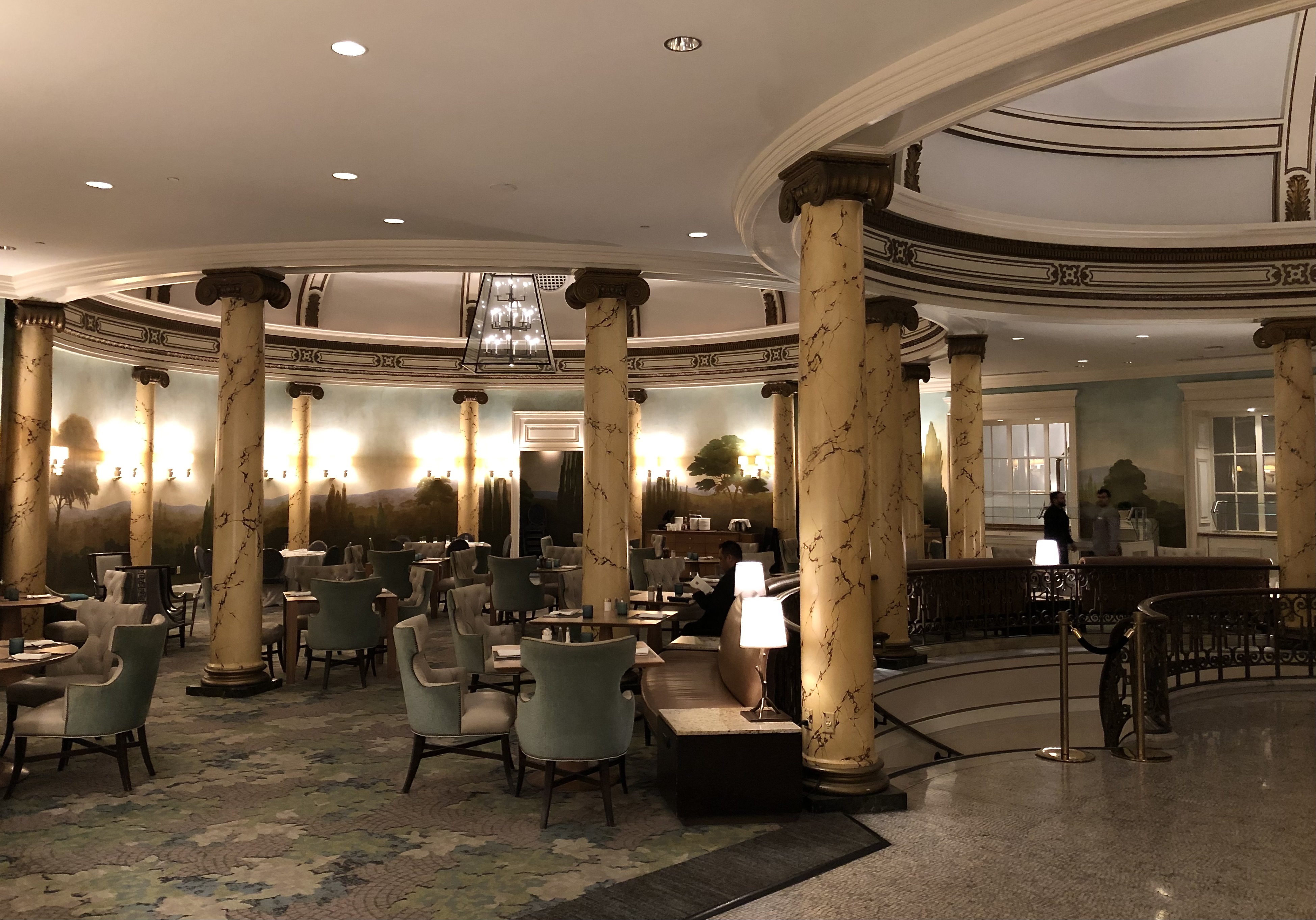 As I was arriving the day I took these photos, Kamala Harris had only just departed. This explained the extensive security check as I entered the hotel’s still grand lobby. Costume the current guests properly and I’d believe I’d been swept back to Boothby’s era. Though much has changed over the years at the Fairmont, the two photos below—1907 on the left and 2022 on the right—of the lobby level’s Laurel Court restaurant and bar demonstrate that much also remains the same: