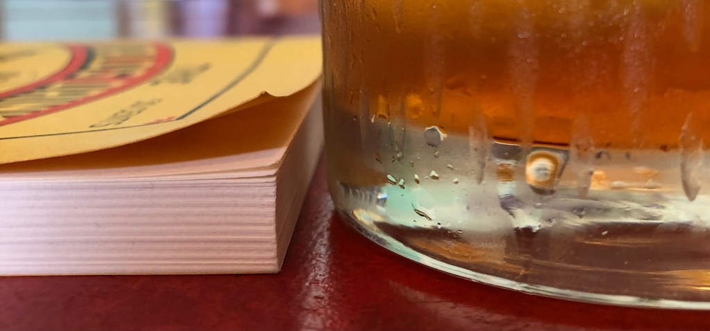 Three freshly mixed cocktails on the bar prompted me to make my stolen visit quick. It occurred to me the cocktails might not be real at all, but the ghosts of cocktails past haunting their former stage. Had Boothby delivered to me a complimentary cocktail flight through the portals of time?