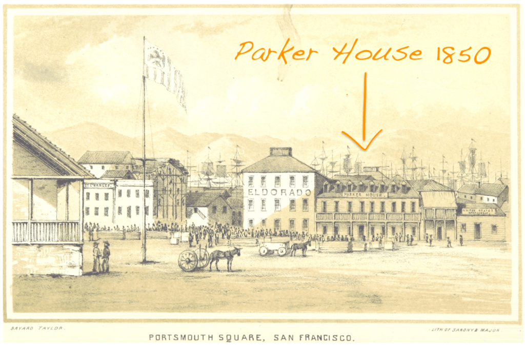As this illustration indicates, the hotel was a two-story, wooden building with additional rooms in its attic space. Second floor rooms had access to a covered balcony area, and windows on any floor offered a prime view of the bustling Portsmouth Square. Parker House was considered the best hotel of its time on the west coast, and catered to its era’s power players—the gold digging gamblers. Carpeted floors, a well stocked bar, multiple billiard tables, paintings of naked women in alluring poses, complimentary wine at the gambling tables to grease the game… San Francisco’s reputation for moneyed extravagance and hedonism had commenced in earnest. For those of us who know contemporary San Francisco rent prices to be astronomical, consider that in the Gold Rush era a room at the Parker House could run $5,000 a month, and was only rented in yearlong commitments—i.e. $60K per year!