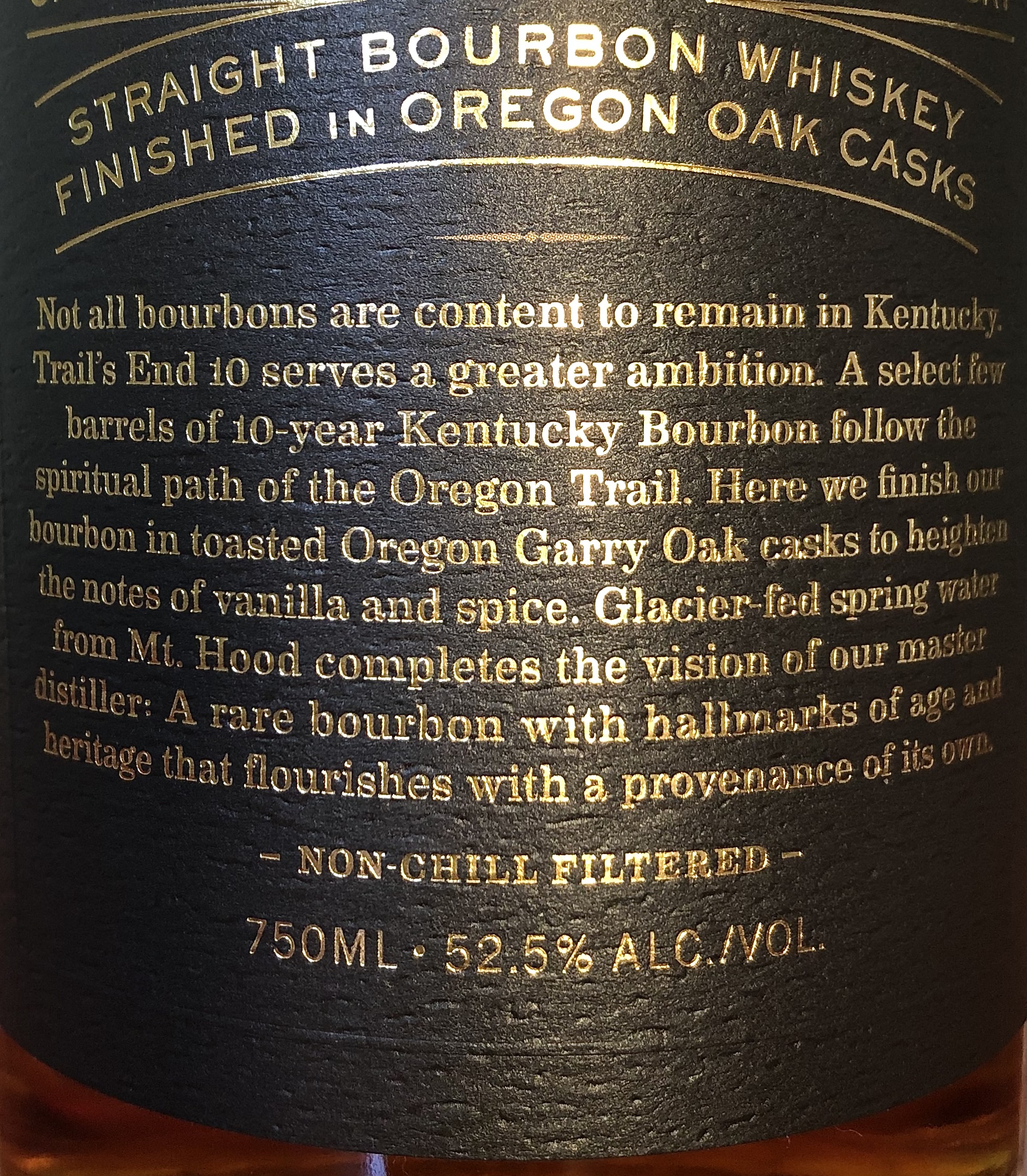 Kentucky bourbon finished in Oregon Garry Oak casks, brought down to proof with glacier-fed spring water from Mt. Hood.MASH BILL – unstated (though a 10% rye quotient is likely)