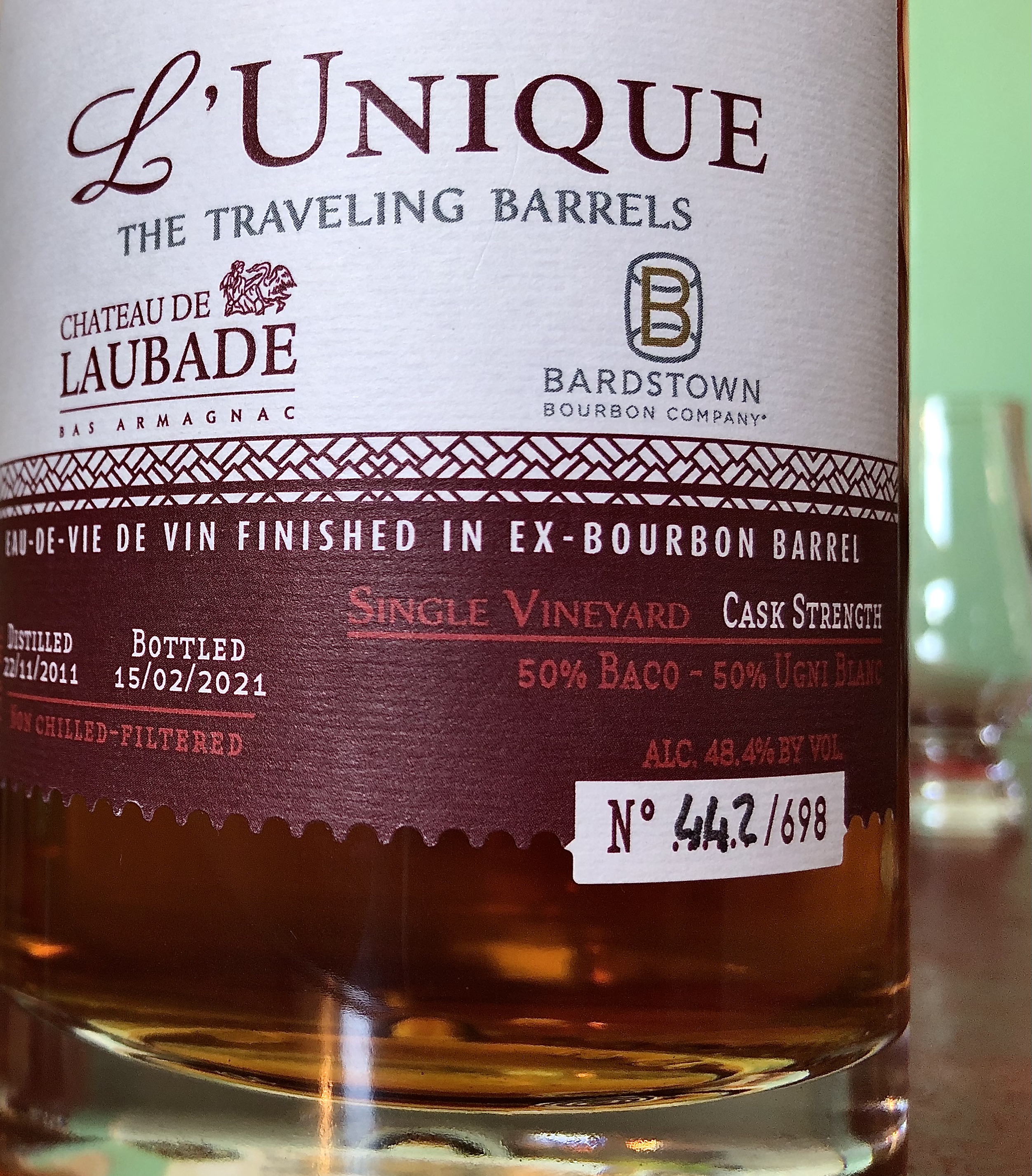 As luck would have it, the store also happened to have a couple bottles of a 2021 Chateau De Laubade Armagnac, dubbed “L’Unique, The Traveling Barrels.” Decently aged at 8+ years, the Armagnac was then finished in one of the very same casks they’d sent to Kentucky for that first collaboration with Bardstown. Those casks were then shipped back to France and put to use again by Chateau De Laubade. What an interesting opportunity, I thought, to compare this Bardstown release and its directly related collaborative partner.