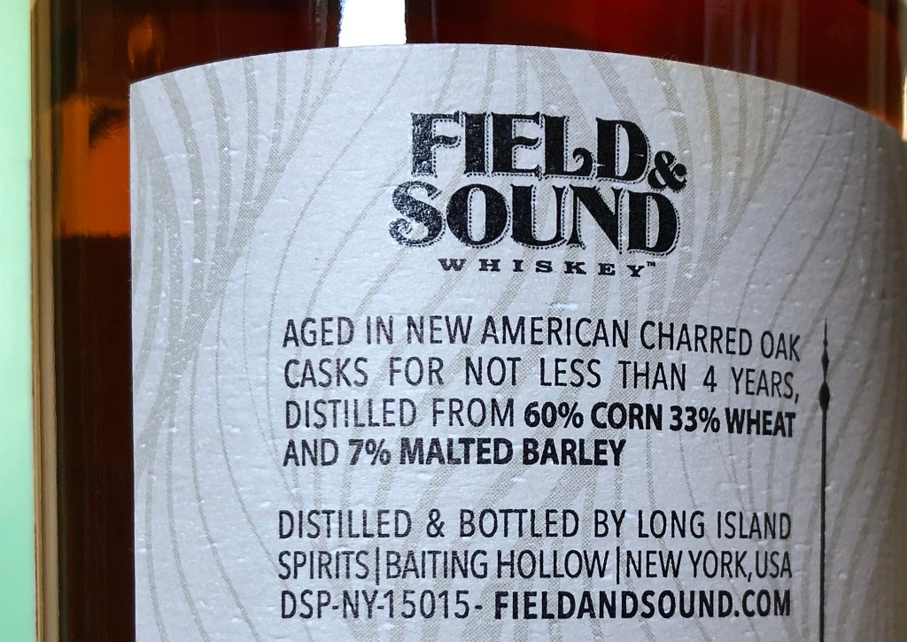 Long Island Distilling was founded in 2007. Located in the rustic North Fork region of Long Island, New York, it is surrounded by over sixty wineries and dozens of pre-revolutionary family-owned potato, corn, and rye farms. Their state of the art distillery is housed in a refurbished, century-old barn. Long Island Spirits uses sustainable distillery practices, buys ingredients from neighboring farms, and bottles all their spirits without chill filtration. Despite their notably wide range of vodkas, gins, liqueurs, and whiskeys, over the years their ambitions have remained much more local than Bardstown’s. Their Rough Rider and Pine Barrens whiskey brands can occasionally be found in California, where I live. But sightings have always been rare. The newer Field & Sound whiskey line first arrived in 2021 with a bottled in bond high-rye bourbon, and two years later has been followed by this bottled in bond wheater.