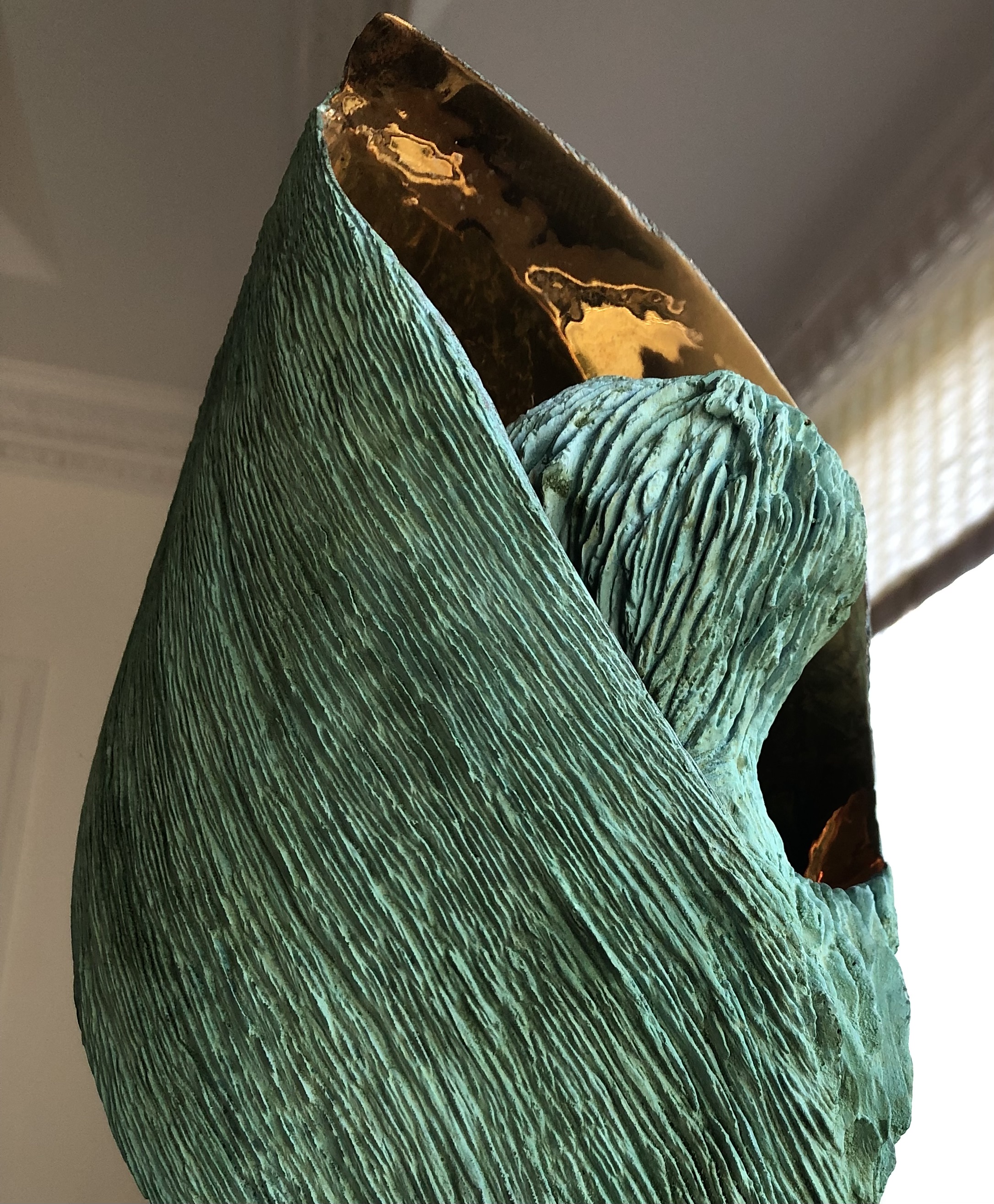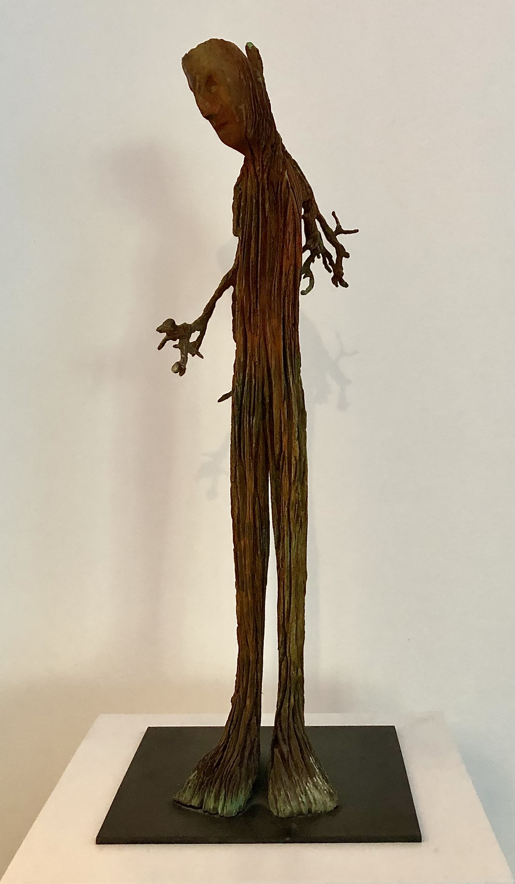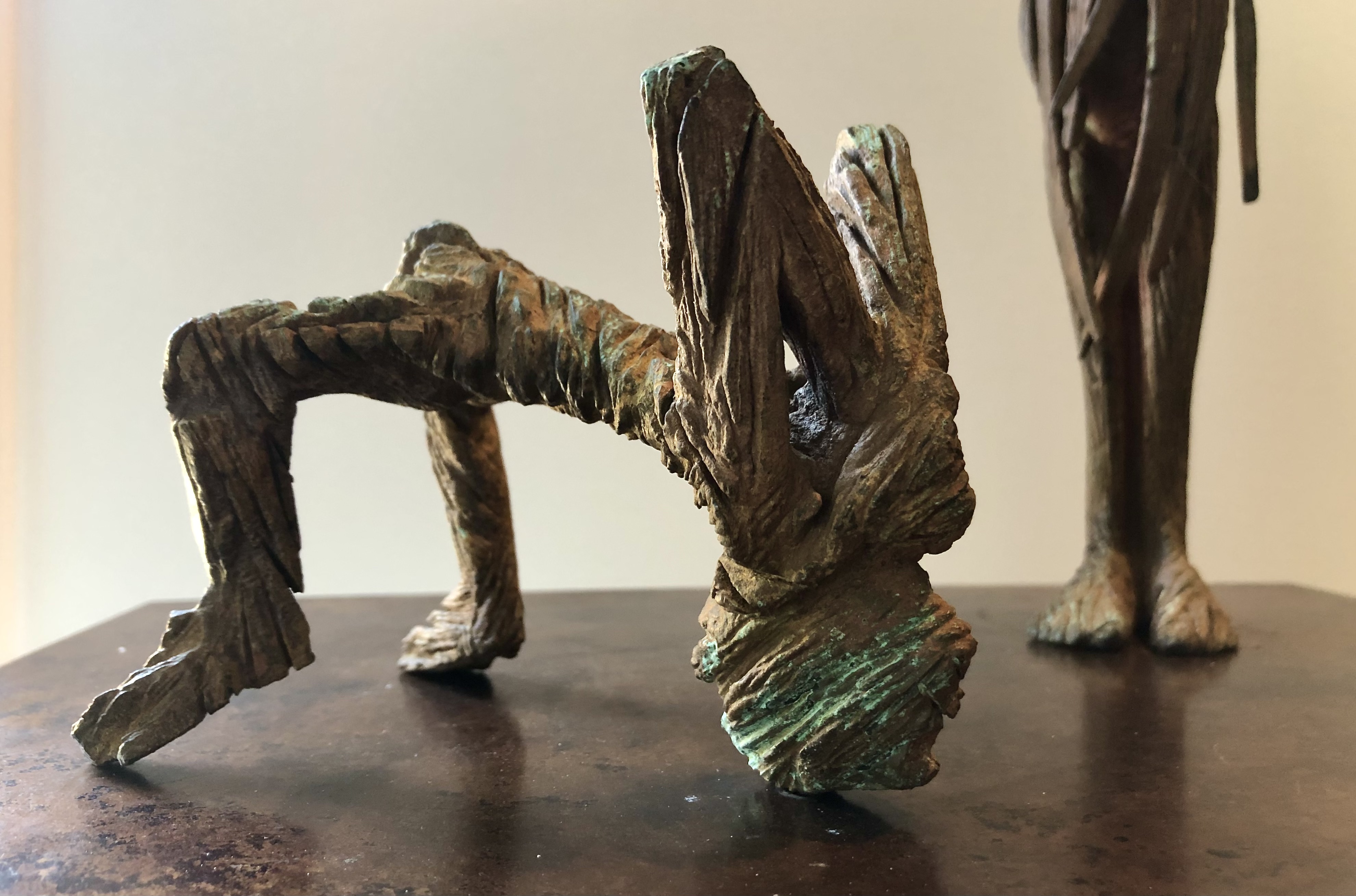 Rather than attempt to encompass Alexander’s multitude of inspirations, I focused in on the raw materials he uses—oak, bronze, gold. Alexander always carves his statues first in oak. These carvings are then bronzed, retaining the original textures of the wood, whether sanded smooth or the naturally rough ridges of their grains left exposed. Sometimes a gold or other patina is added, to capture light in some particular way or alter texture. The finished pieces retain a palpable sense of Alexander’s craftsmanship in action—metal tools shaping wood, bronze casting the effect in time. Each piece appears to still be taking shape, still evolving. And of course the art of what Alexander does is also captured—intuitive decisions made in ongoing response to his sources of inspiration, to his intention for the piece, and to what the wood itself offers in the way of texture, grain, shape, color, resistance, pliability.