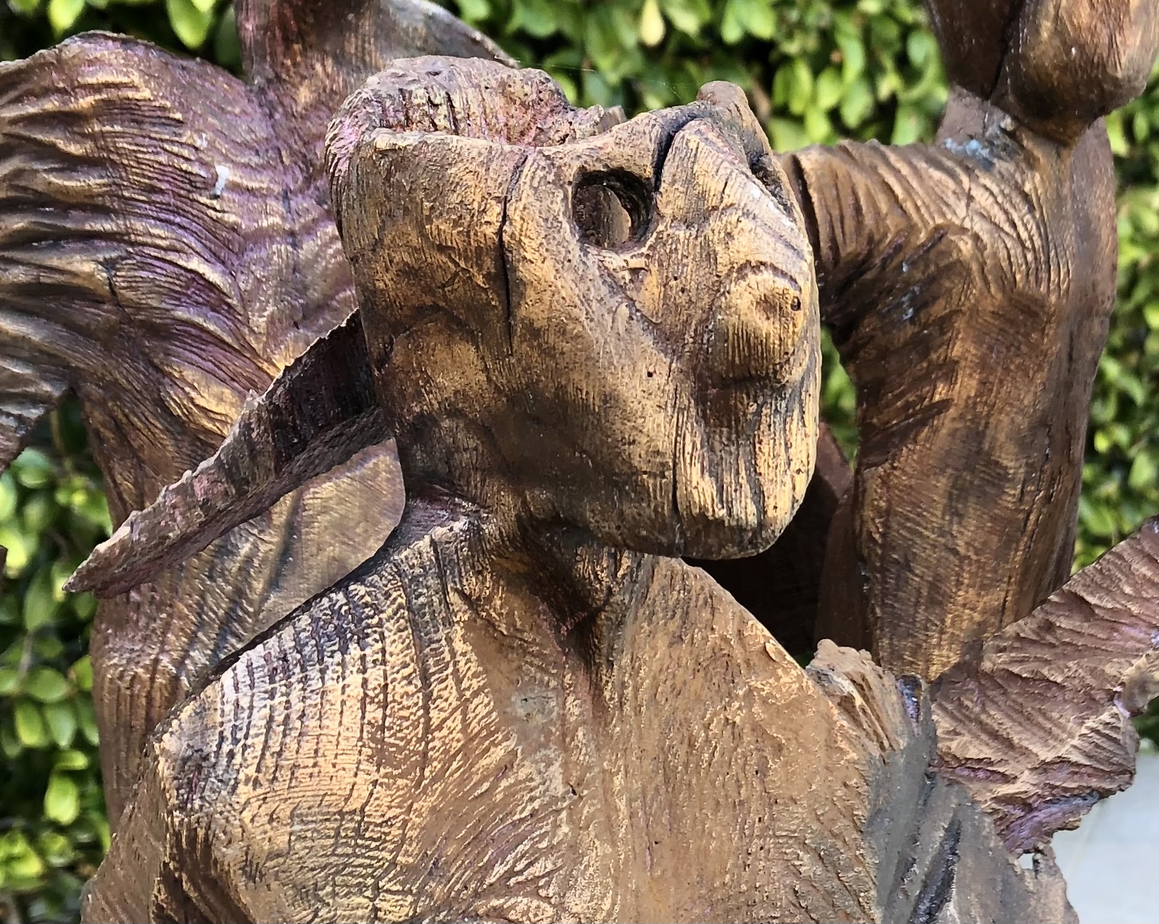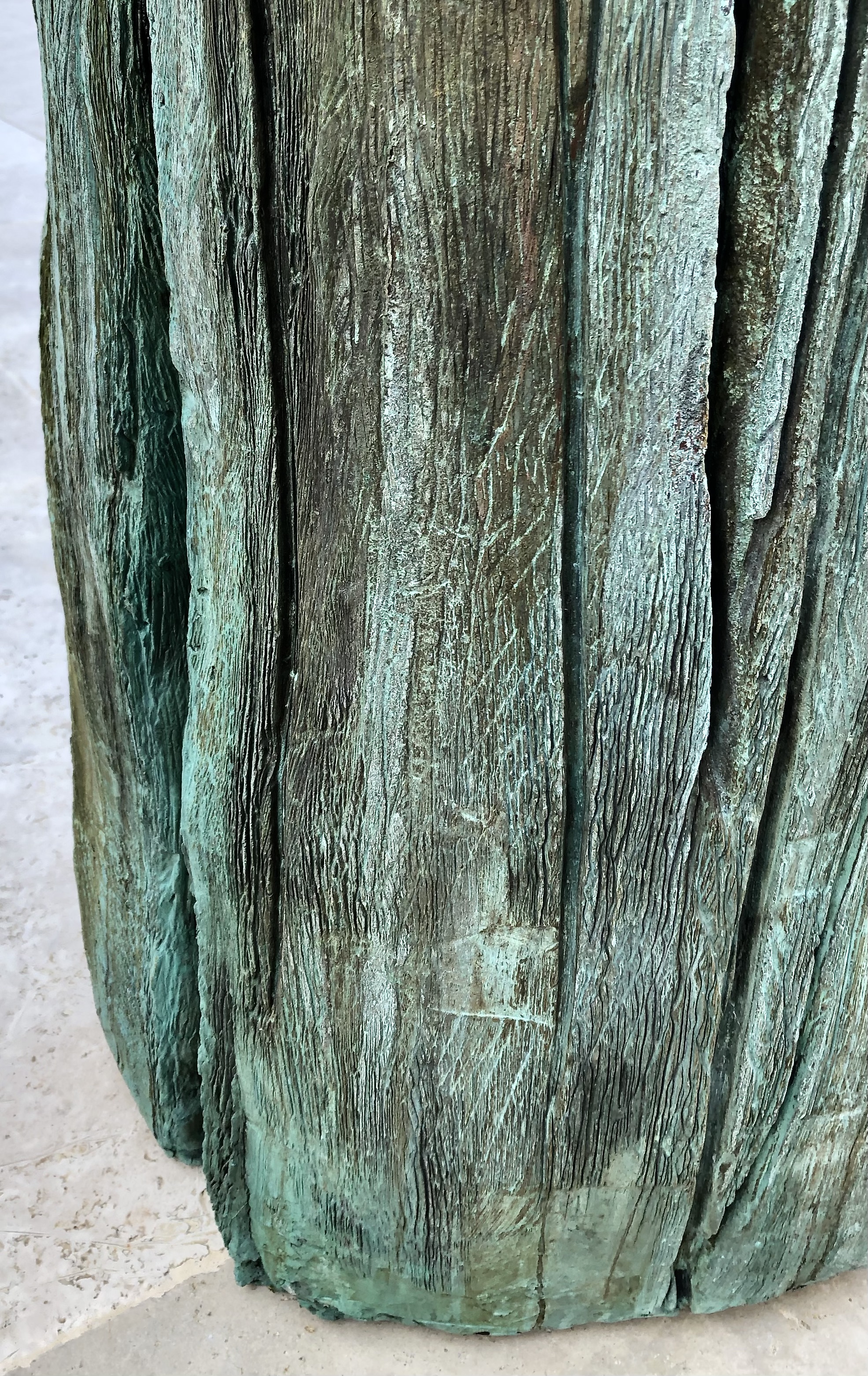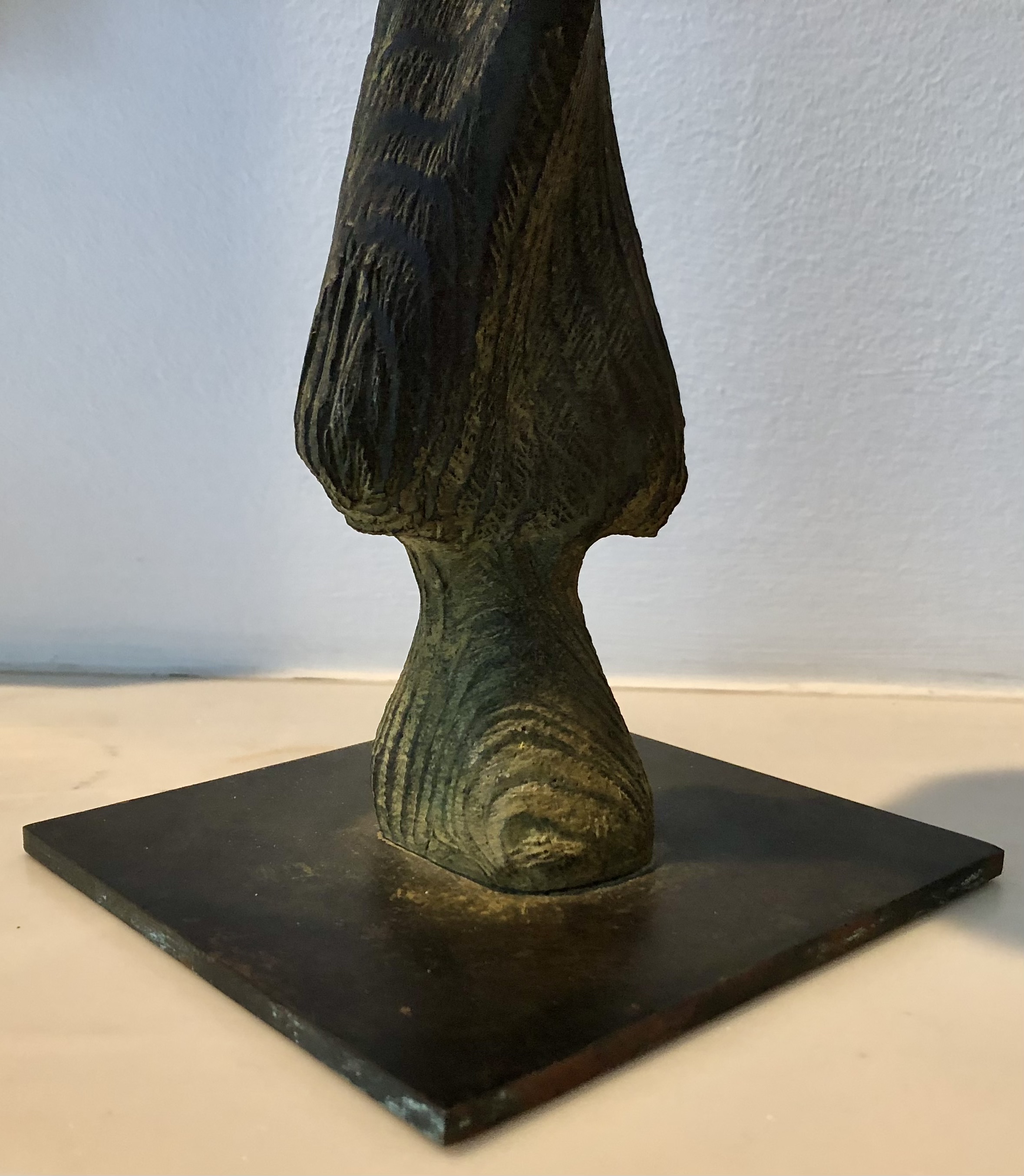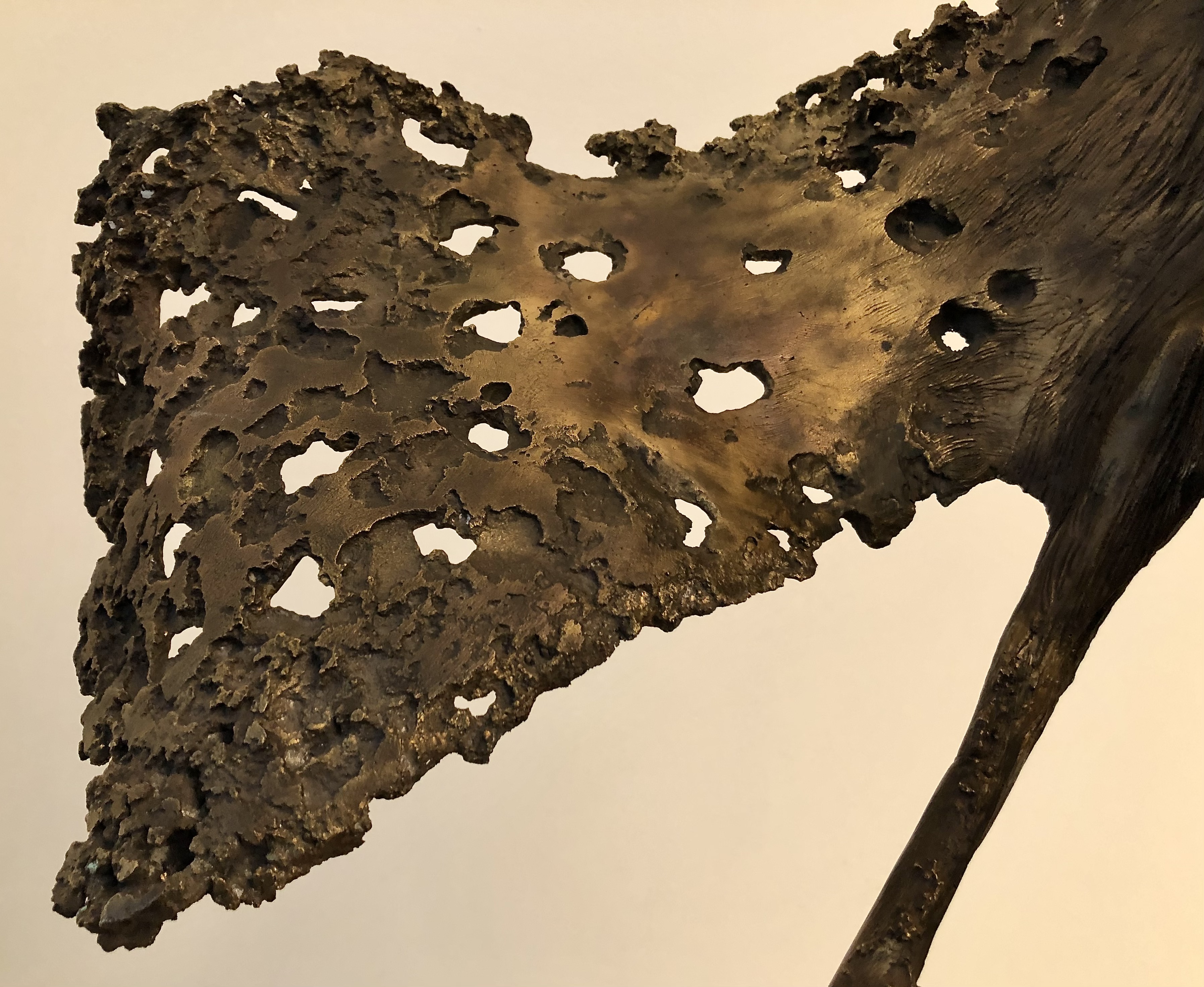 Rather than attempt to encompass Alexander’s multitude of inspirations, I focused in on the raw materials he uses—oak, bronze, gold. Alexander always carves his statues first in oak. These carvings are then bronzed, retaining the original textures of the wood, whether sanded smooth or the naturally rough ridges of their grains left exposed. Sometimes a gold or other patina is added, to capture light in some particular way or alter texture. The finished pieces retain a palpable sense of Alexander’s craftsmanship in action—metal tools shaping wood, bronze casting the effect in time. Each piece appears to still be taking shape, still evolving. And of course the art of what Alexander does is also captured—intuitive decisions made in ongoing response to his sources of inspiration, to his intention for the piece, and to what the wood itself offers in the way of texture, grain, shape, color, resistance, pliability.