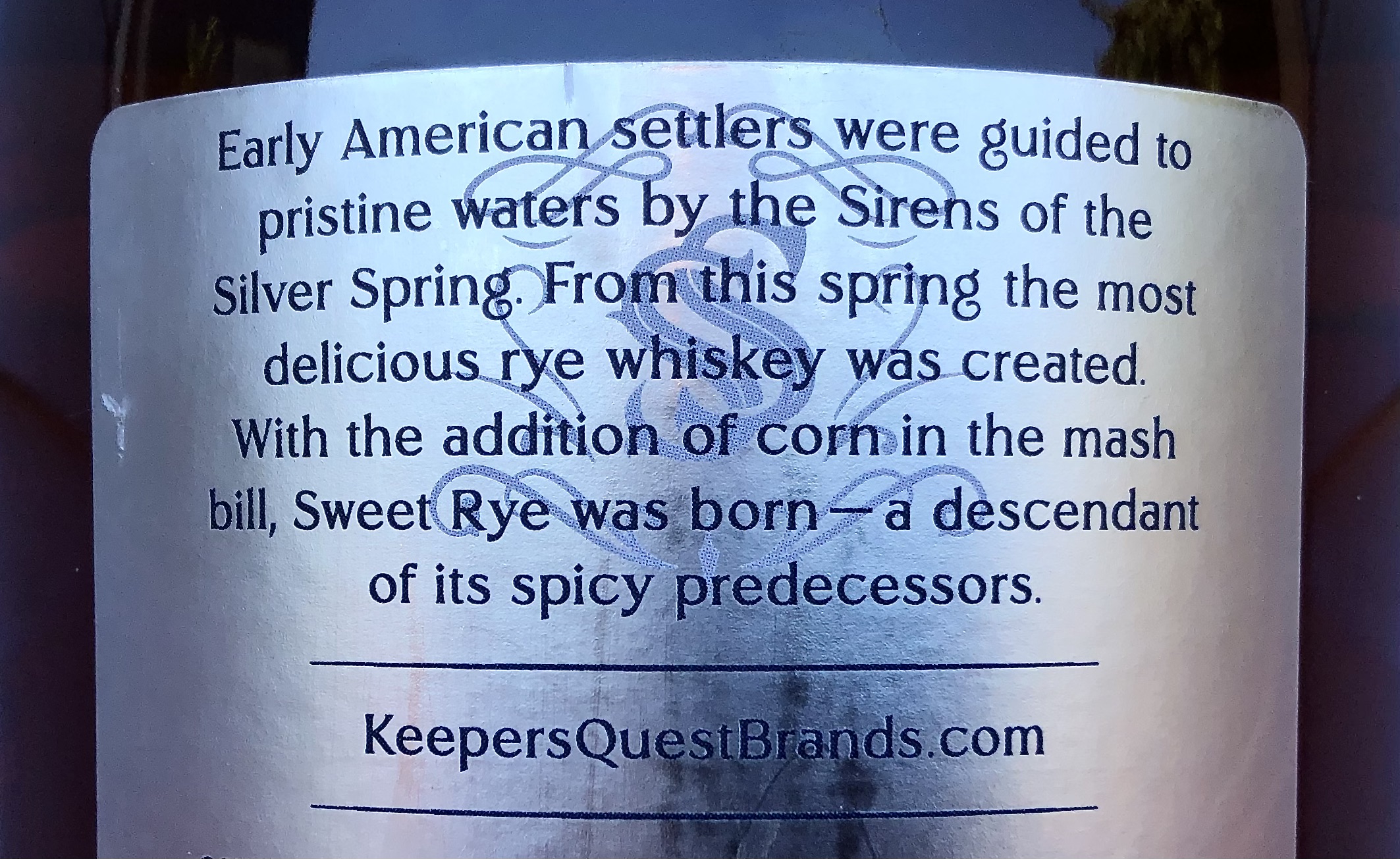 The producer, Keeper’s Quest Brands, sounds like a fantasy role-playing game operation. But it’s a Tennessee spirits importer / exporter/ producer dealing with an eclectic range of products, among them American bourbons and ryes, scotch whiskies, and British gin. Keeper’s Quest does not distill Silver Springs Sweet Rye. They bottle and sell it. And it’s a true curiosity.