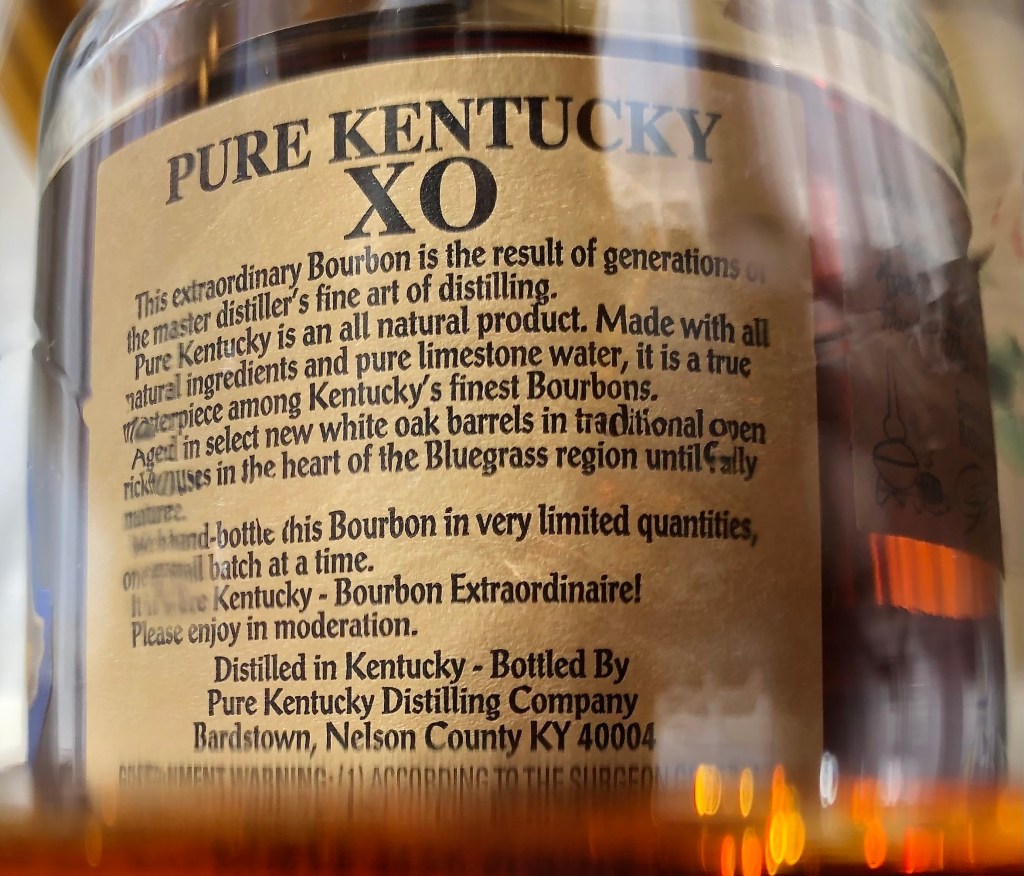 Pure Kentucky XO never had a prominent age statement beyond its suggestive “XO,” though the Google rabbit hole reveals claims of labels circa 2011 with the intriguing fine print, “Barrel aged for at least 12 years, or more, depending upon climatic seasons.” The brand was thought to be the older sibling alongside Kentucky Vintage and Old Bardstown Estate Bottled. The age of any of these brands today is almost certainly in the single digits. By 2016, even that ~2011 fine print recognizing the impact of climate change on a bourbon’s age (😉) had been removed. So the bottle in my hand is very likely predominantly single-digit whiskey, if not entirely so.