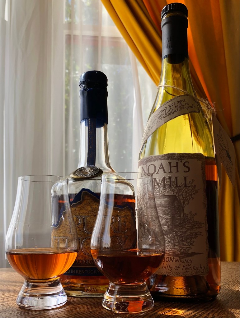 On the taste and finish, the Pure Kentucky XO strikes me now with its creamy texture, the caramels more buttery than earlier. That butteriness continues into the oaky, chocolatey, slightly bitter finish. With the Noah’s Mill, I get a waterier texture, waterier flavors emphasizing oak and orange zest, leaving oak, oak tannins, and a numbing heat to linger on the finish.