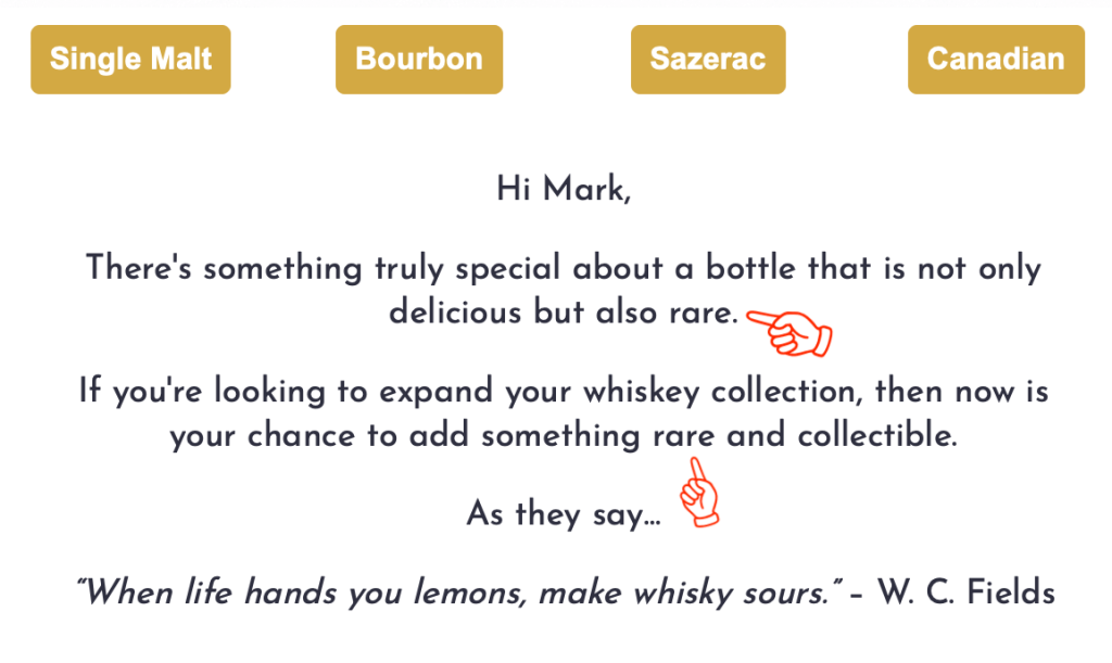 I get emails from other shops that don’t claim rarity. They might say it’s allocated, which is verifiably true of some whiskeys. They might say it’s a single barrel and so they only have so much in stock, also true. But if it’s popular, they’ll likely get another single barrel of the same brand next season, so, though limited in number per barrel, and seasonal, still it’s not rare. It’s every year—so long as people keep buying it. And chances are other local shops will have their own single barrels of the same popular brand. So, options!