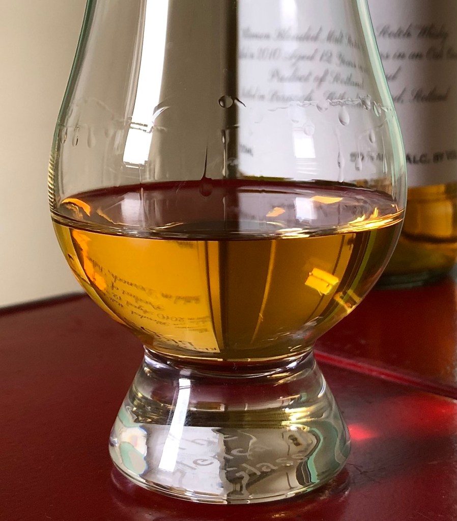 Filled into a used sherry butt in 2010, then transferred to Dornach and bottled at 100 proof without added color or chill filtering, it’s a “blended” whisky because a teaspoon of something else was added to it, negating its single malt status. This teaspooning trick is a longstanding method by which larger distilleries protect their single malt brand name while making money selling off excess barrels to independent bottlers like Thompson/Dornoch. It also benefits the consumer, since single malts go for higher prices than blends.