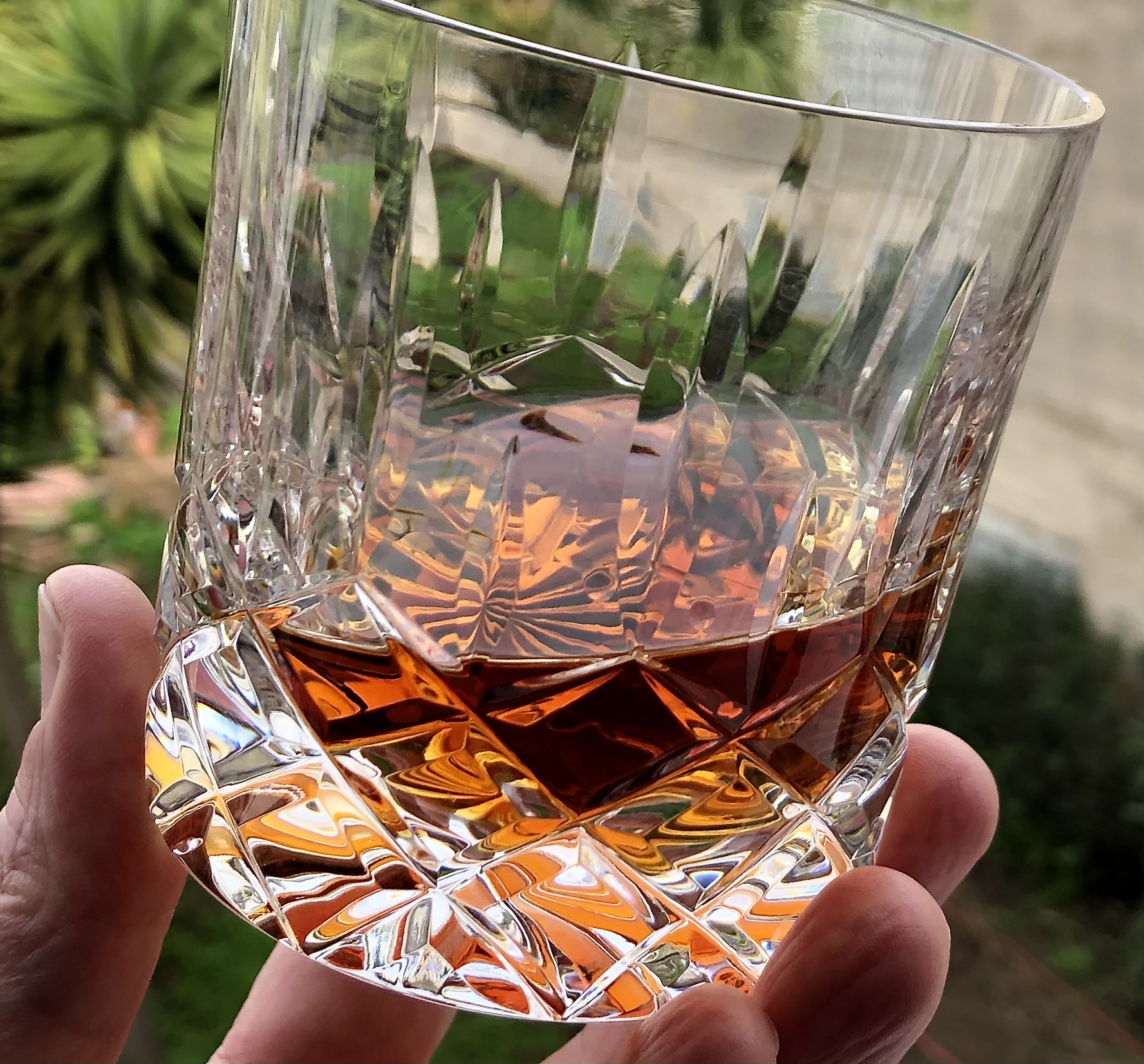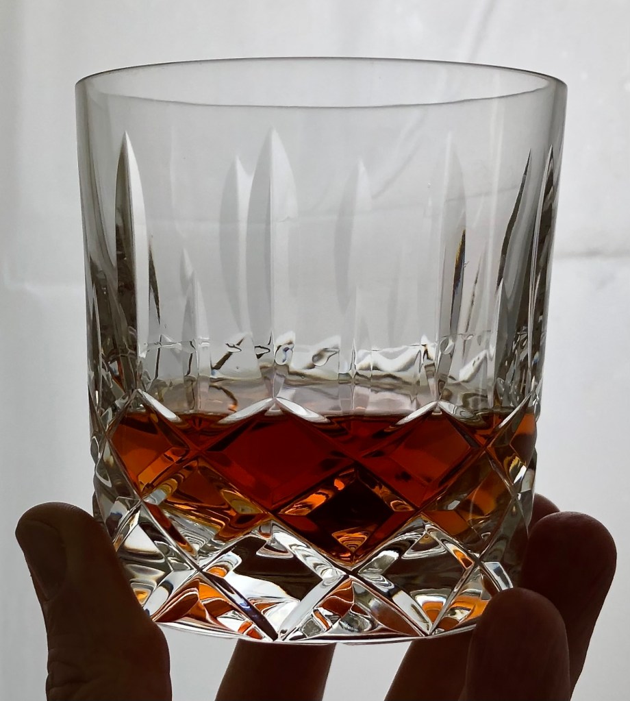 That tumbler, by the way, is a Waterford from 1953, a wedding present to my late aunt and uncle that was handed down to me this past Christmas. Their daughter, my cousin, kept the family house when my aunt eventually passed, and the living room there remains a virtual museum exhibition of a midcentury American upper-middle class entertaining space. There’s the bar encased in a teakwood cupboard. The wide, low, rectangular couches and chairs. The fireplace outlined in thin moderne tiling. Lots of low wide rectangular shapes, mirrored by the house itself, echoing Frank Lloyd Wright’s lingering pervasive influence. This old cocktail glass served guests for decades in that room. And this bourbon fits perfectly in it, conjuring a time when the 1940s were still reverberating into the early 1950s—old school and new school commingling in a lingering post-war stupor turned cold-war stupor, bejeweled with smiles and crystal tumblers.