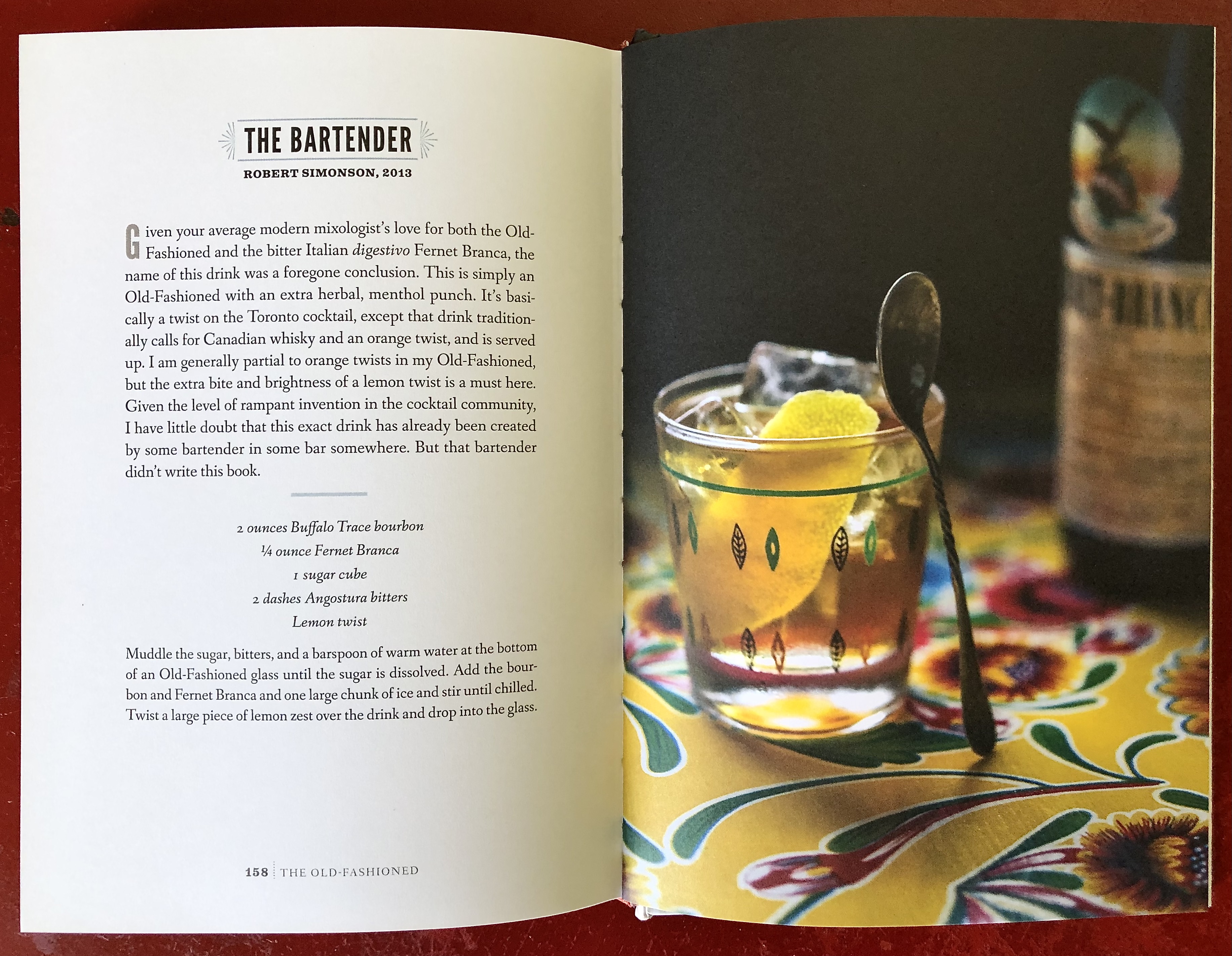 Experimenting with recipes and tweaks on recipes, I found myself honing in on the classic Whiskey Sour and Old-Fashioned as my go-to templates. Of the two, the Old-Fashioned was the simpler to execute. So when I heard about Robert Simonson’s 2014 book dedicated to the history of this key cocktail, I headed straight on over to The Booksmith.