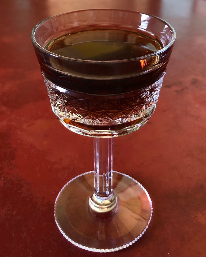 Given the heavy sherry influence, and as I have no sherry on my bar shelf just now, I tried using this Arran as a sherry substitute in a cocktail I’ve been tinkering with lately, based on one I had at Bar High Five in Tokyo this past year. It’s comprised of Fuji Gotemba Riku whisky, walnut liqueur (acorn liqueur originally but I couldn’t find any) and sherry. The Arran did a pretty great job as understudy to the sherry.