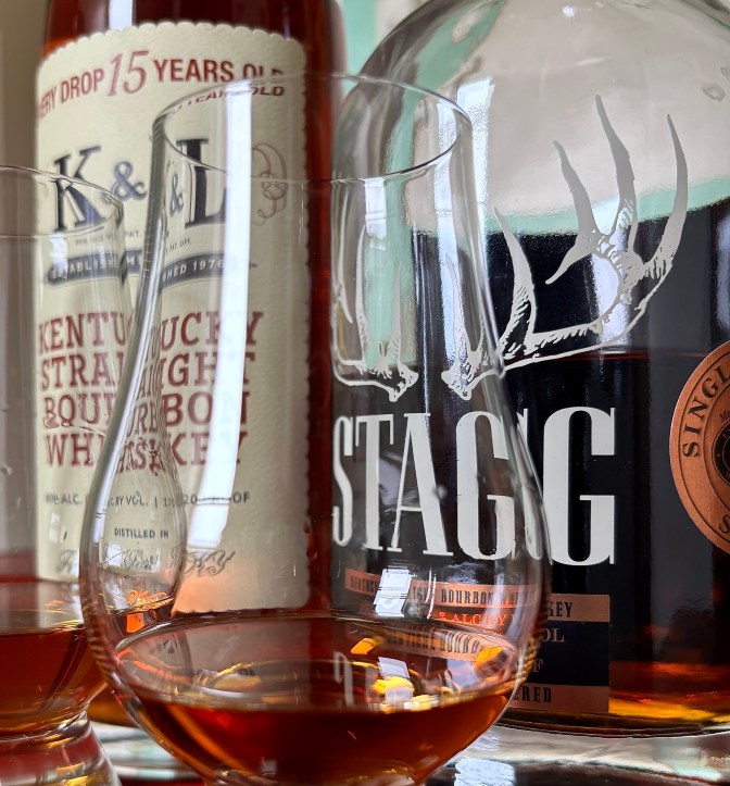 I poured a bit of Stagg (formerly Junior) single barrel, also picked by K&L. Its age is unstated. But the proof is 123.4, not far off from the “Buffalo Turkey” release.