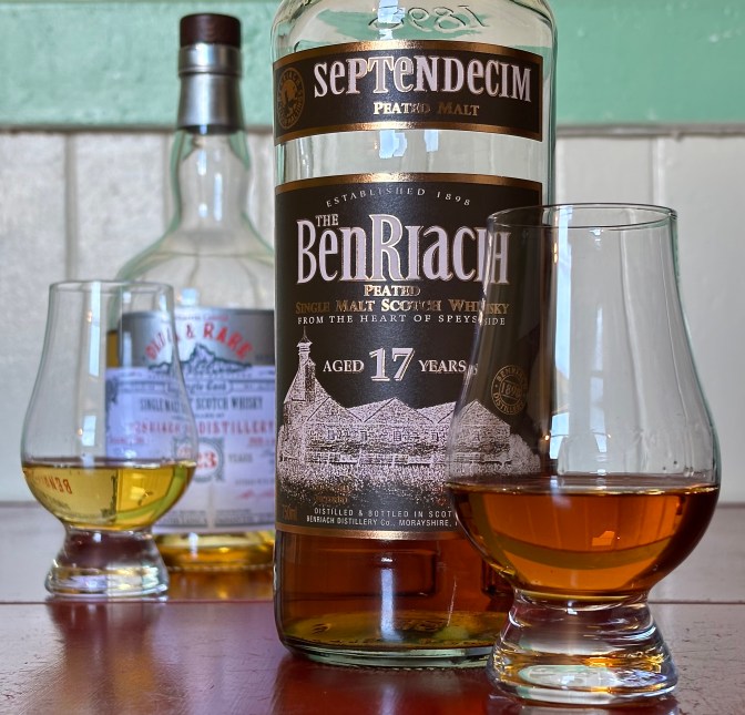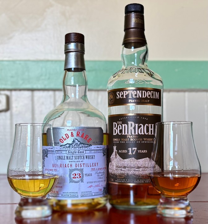 This variance is perfectly demonstrated by these two BenRiach bottlings. The well-aged 2020 release from Hunter Laing’s Old & Rare series highlights the sweeter sides of scotch, while the teenaged 2015 distillery-direct Septendecim (latin for 17) provides as industrial a peat note as one could imagine. As examples of the range possible within a single distillery—BenRiach—as well as a single region—Speyside—I thought they’d make an interesting comparison.