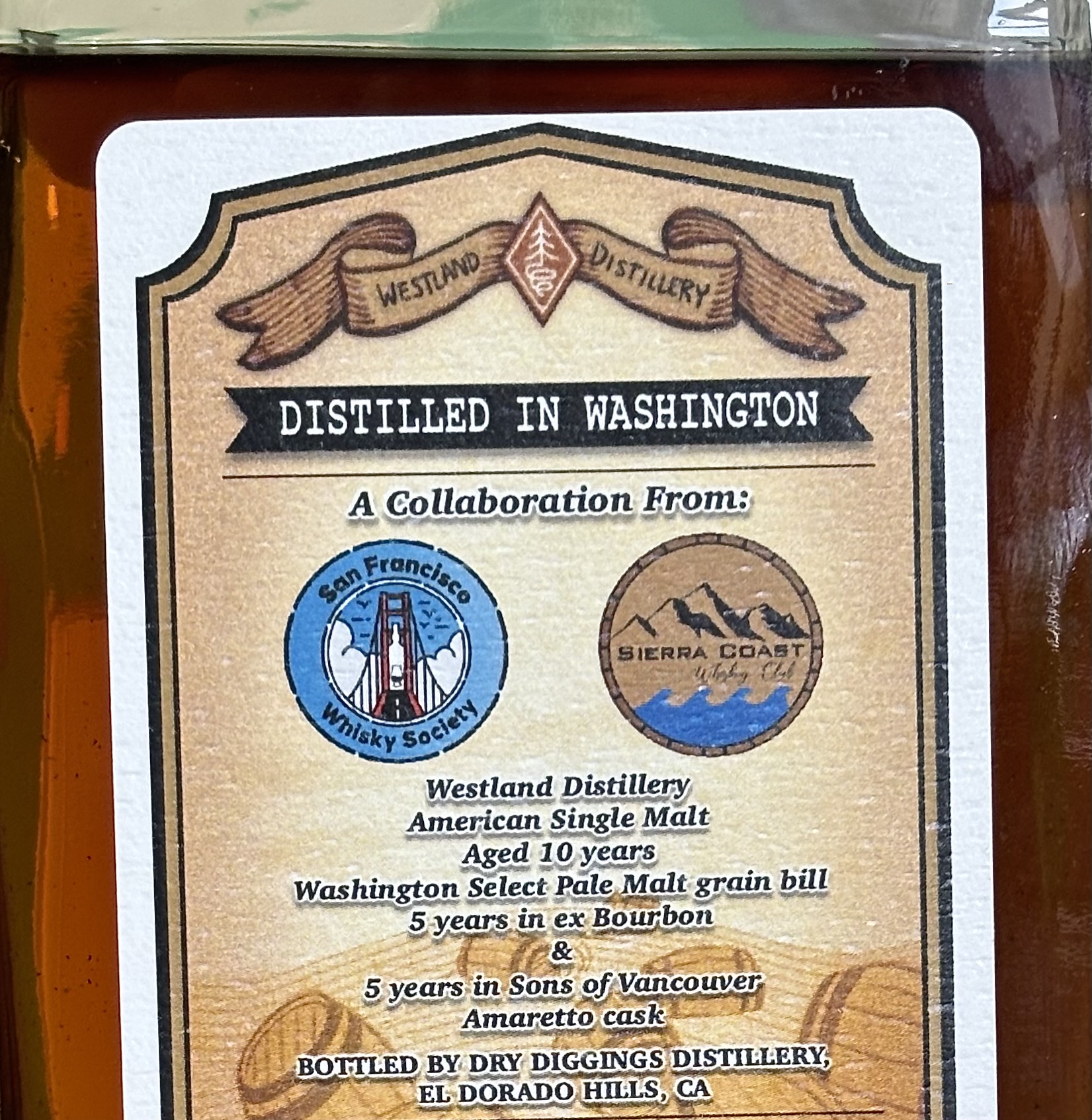 Two whiskey clubs based in Northern California teamed up to select a barrel of single malt from Westland Distillery in Seattle, Washington. They got Dry Diggings Distillery in El Dorado Hills, California, to bottle it for them, since whiskey clubs can’t legally do that themselves. So the whiskey is sold by Dry Diggings. Westland had aged it for 5 years in an ex-bourbon cask. Pretty normal. But then they aged it another 5 years in an ex-amaretto cask procured from a distillery in Vancouver, Canada, called Sons of Vancouver. After a full 10 years of aging, there was enough whiskey left in the cask to fill 156 bottles. They were offered first to members of the two clubs before going on public sale through Dry Diggings. As a San Francisco Whiskey Society member, I jumped at the prospect pretty quickly.