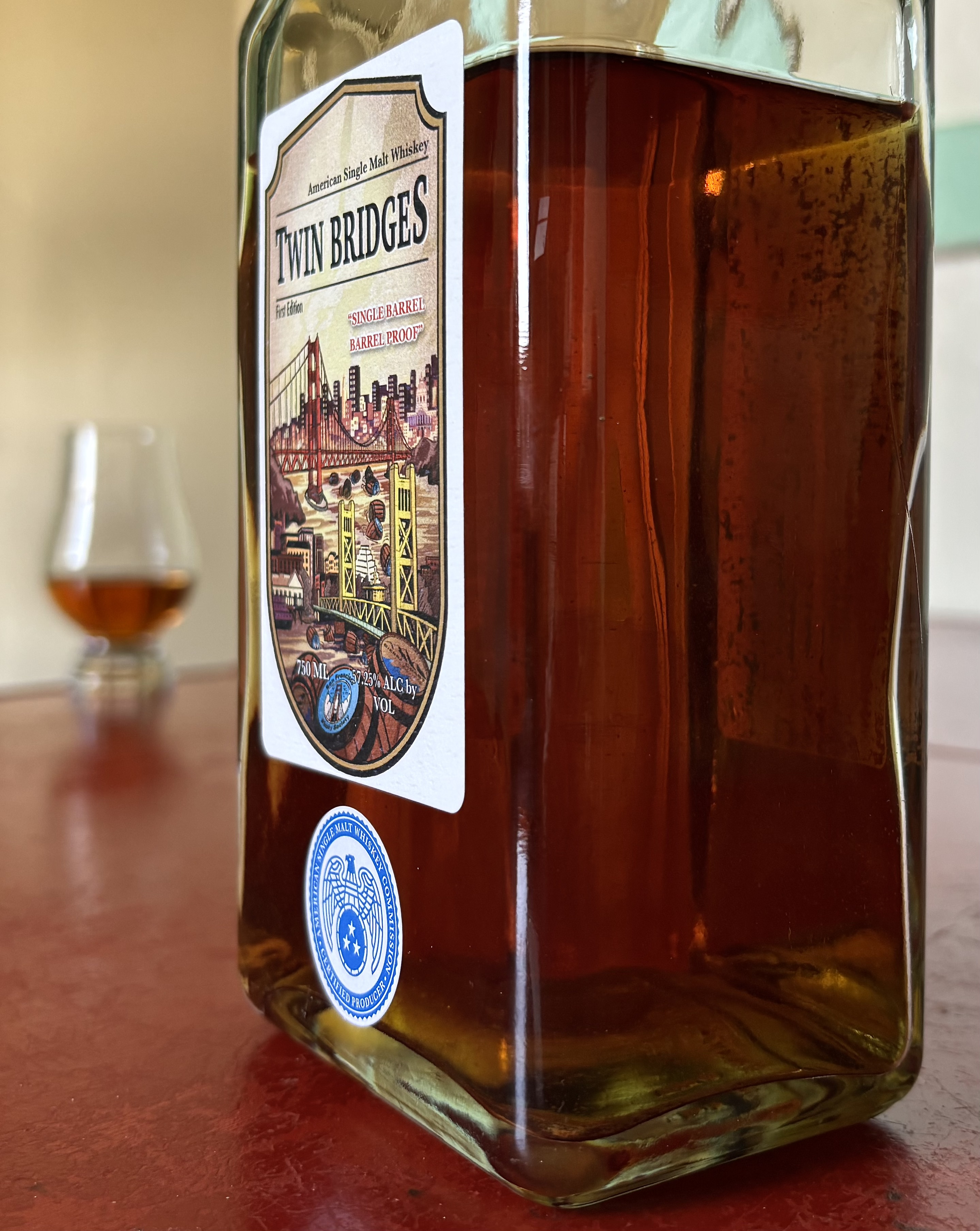 I’m also quite reminded of some variations on the Godfather cocktail I’ve made lately. The Godfather hit bar menus in the 1970s. A simple two-ingredient combo of scotch or bourbon with amaretto, the cocktail has no connection to the famous film other than to have capitalized on its popularity. One might stretch an argument that the amaretto aspect vaguely conjures the Mediterranean flavors of Sicily. But anyway, if you poured this Twin Bridges Single Malt over a large ice rock and told me it was a Godfather cocktail I’d believe you.