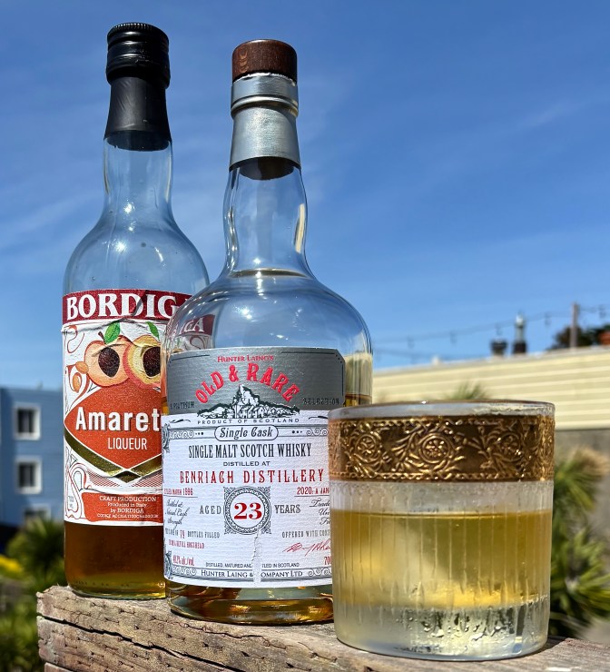 To test that theory, I made a Godfather. Based on the vibrant and fruity nature of the Twin Bridges, I chose a similarly vibrant fruity BenRiach 23-Year scotch. For the amaretto, Bordiga. The recipe is pretty straight forward—2oz whisky to 0.25oz amaretto, mixed in the glass over a big ice rock.