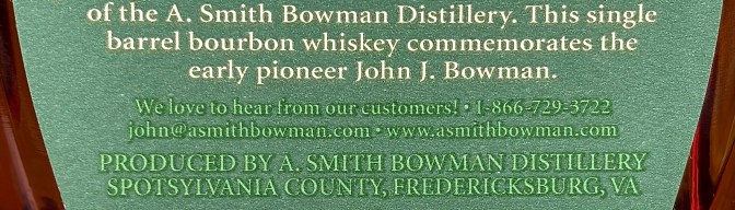 The last bottle of John J. Bowman I enjoyed was a 2017 SiB, which I finally uncorked in 2020. It was excellent, just as a 2016 bottle had also been. Coming across like a suped-up rendition of the Buffalo Trace namesake bourbon, the Bowman SiB offered the fruity and oaky notes one associates with decently aged Buffalo Trace, with an added ringing quality from the copper pot distillation that A. Smith Bowman Distillery puts the distillate through after receiving it from Buffalo Trace.