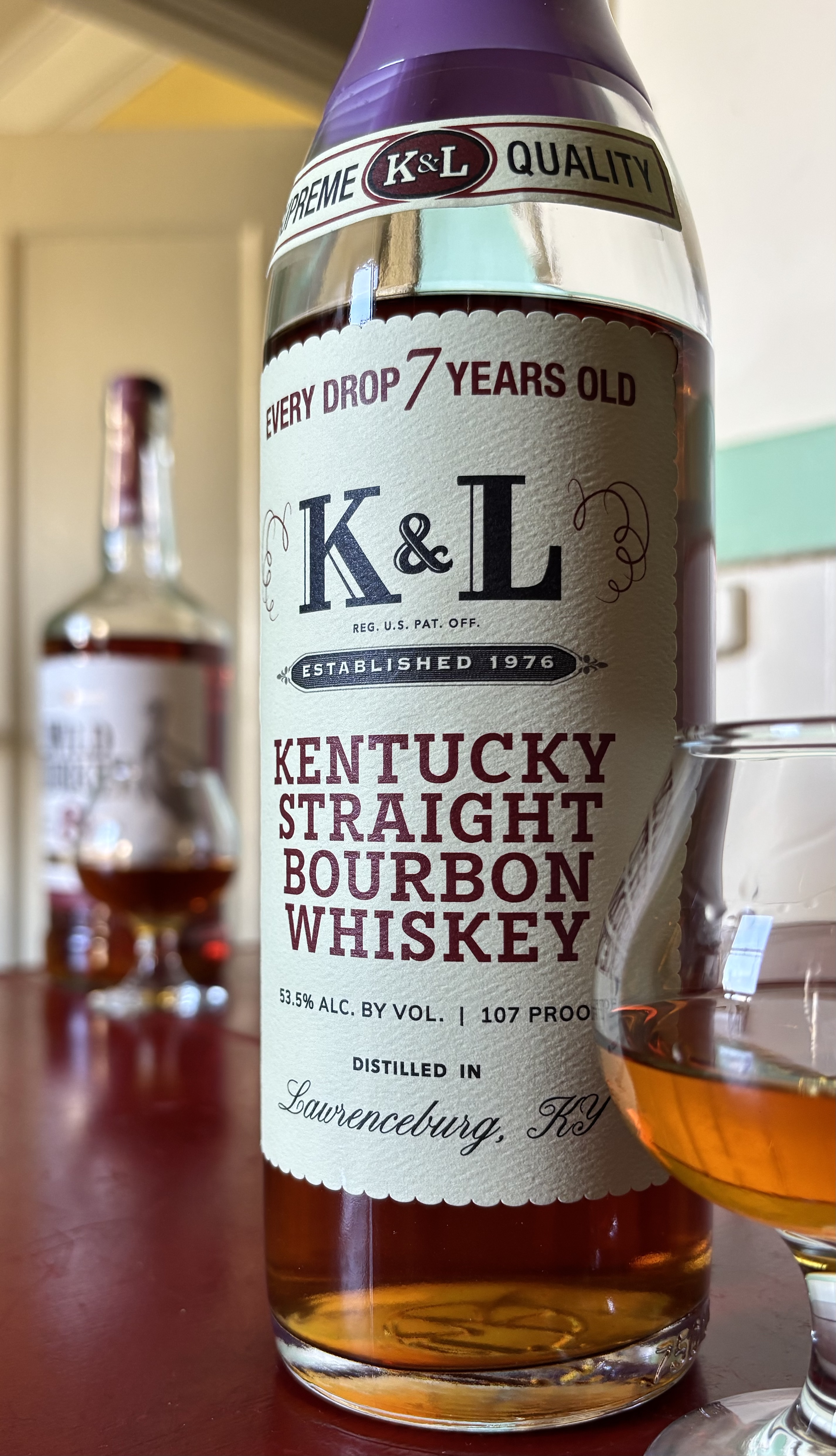 K&L’s latest Every Drop release is a small batch blend of ten barrels from Wild Turkey, all aged 7 years. K&L bottled it at 107 proof, a nod to the original entry proof at which Wild Turkey barreled their bourbons until the early 2000s, when economics pressured them up to 110 and then 115 proof.