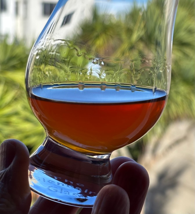 So let’s get a sip of this small-town California single malt. Here we are, just a week after uncorking and three pours into the bottle. These brief notes were taken using a traditional Glencairn.